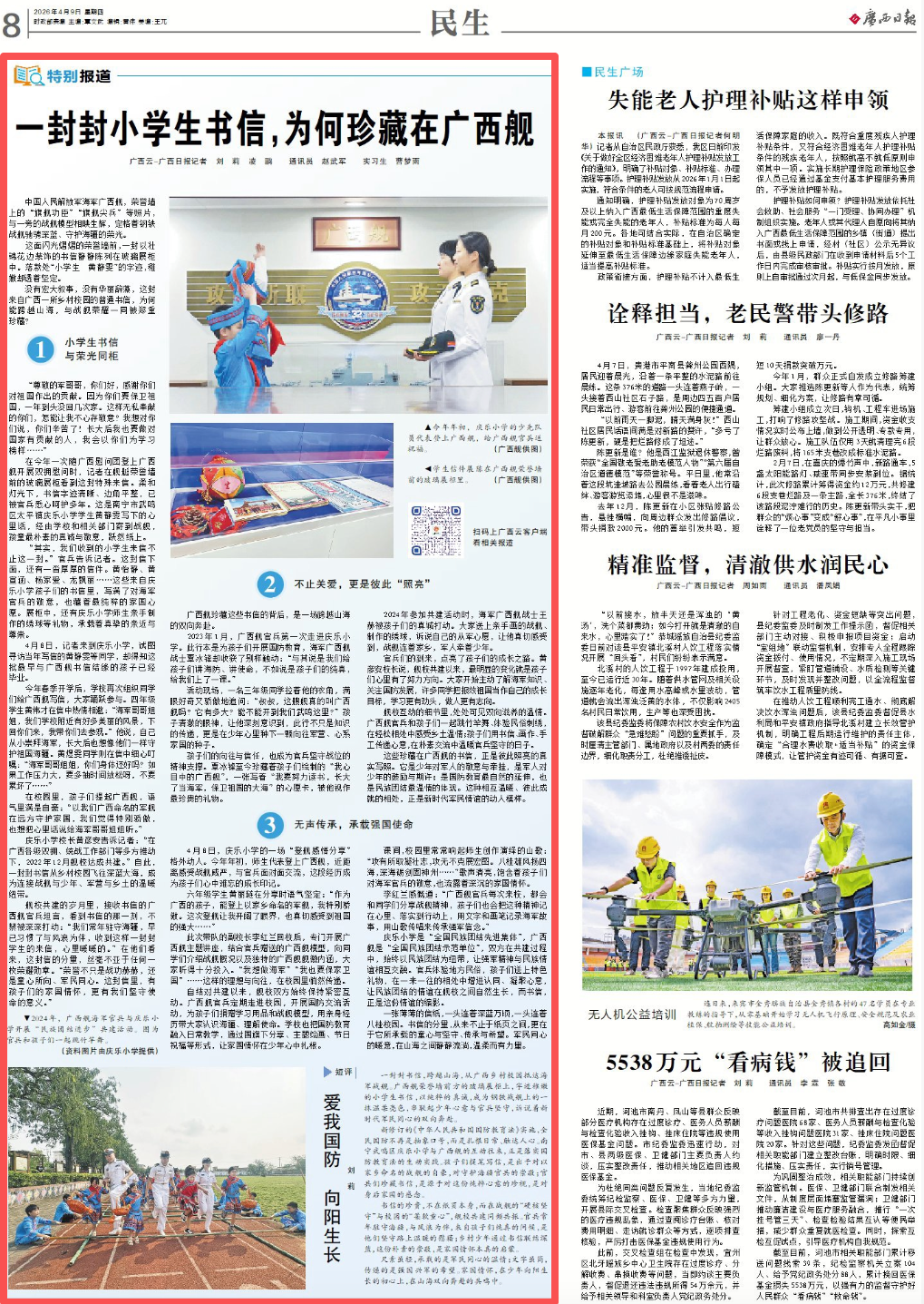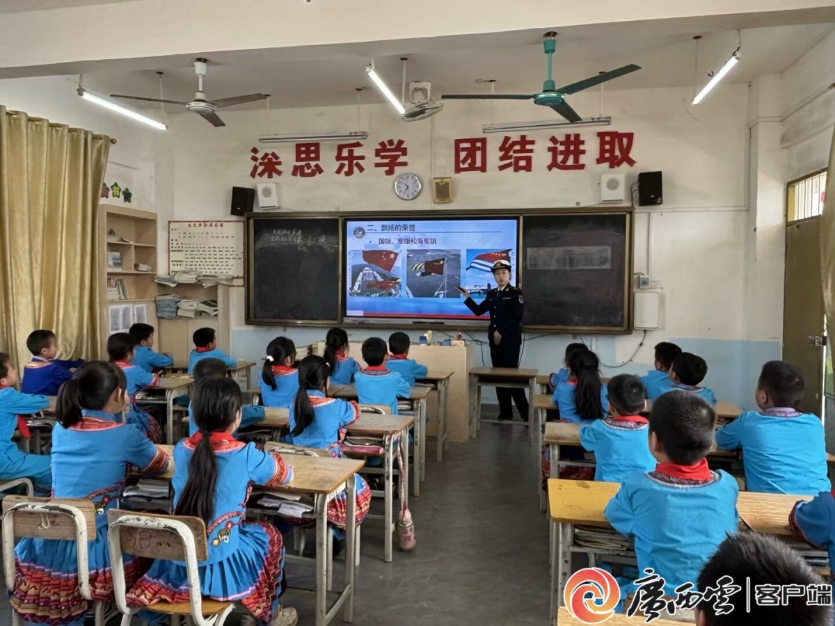 庆乐小学副校长李红兰开展广西舰主题讲座。广西云-广西日报记者 凌鹏 摄 自结对共建以来,舰校双方始终保持紧密互动。广西舰官兵定期走进校园,开展国防交流活动,为孩子们捐赠学习用品和战舰模型,用亲身经历带大家认识海疆、理解使命。学校也把国防教育融入日常教学,通过国旗下分享、主题绘画、节日祝福等形式,让家国情怀在少年心中扎根。 课间,校园里常常响起师生创作演绎的山歌:“攻有所取凝壮志,攻无不克展宏图。八桂雄风扬四海,深海砺剑固神州……”歌声清亮,饱含着孩子们对海军官兵的敬意,也流露着深沉的家国情怀。 李红兰感慨道:“广西舰官兵每次来校,都会和同学们分享战舰精神,孩子们也会把这种精神记在心里、落实到行动上,用文字和画笔记录海军故事,用山歌传唱来传承强军信念。” 庆乐小学是“全国民族团结先进集体”,广西舰是“全国民族团结示范单位”,双方在共建过程中,始终以民族团结为纽带,让强军精神与民族情谊相互交融。官兵体验地方民俗,孩子们送上特色礼物,在一来一往的相处中增进认同、凝聚心意,让民族团结的情谊在舰校之间自然生长,而书信,正是这份情谊的缩影。 一张薄薄的信纸,一头连着深蓝万顷,一头连着八桂校园。书信的分量,从来不止于纸页之间,更在于它所承载的童心与坚守、传承与希望。军民同心的暖意,在山海之间静静流淌,温柔而有力量。 ■短 评 爱我国防 向阳生长 刘 莉 一封封书信,跨越山海,从广西乡村校园抵达海军战舰。广西舰荣誉墙前方的玻璃展柜上,字迹稚嫩的小学生书信,以纯粹的真诚,成为钢铁战舰上的一抹温柔亮色,串联起少年心意与官兵坚守,诉说着新时代军民同心的双向奔赴。 新修订的《中华人民共和国国防教育法》实施,全民国防不再是抽象口号,而是扎根日常、触达人心。南宁武鸣区庆乐小学与广西舰的互动往来,正是落实国防教育法的生动实践。孩子们提笔写信,是出于对以家乡命名的战舰的自豪,对守护海疆官兵的崇敬;官兵们珍藏书信,是源于对这份纯粹心意的珍视,是对身后家国的感念。 书信的珍贵,不在纸页本身,而在战舰的“硬核坚守”与校园的“柔软童心”,舰校共建同频共振。官兵常年驻守海疆,与风浪为伴,来自孩子们纯真的问候,是他们坚守路上温暖的慰藉;乡村少年通过书信联结深蓝,这份朴素的崇敬,是家国情怀本真的启蒙。 尺素虽轻,承载的是军民同心的温情;文字虽简,传递的是强国兴军的希望。家国情怀,在少年向阳生长的初心上,在山海双向奔赴的共鸣中。