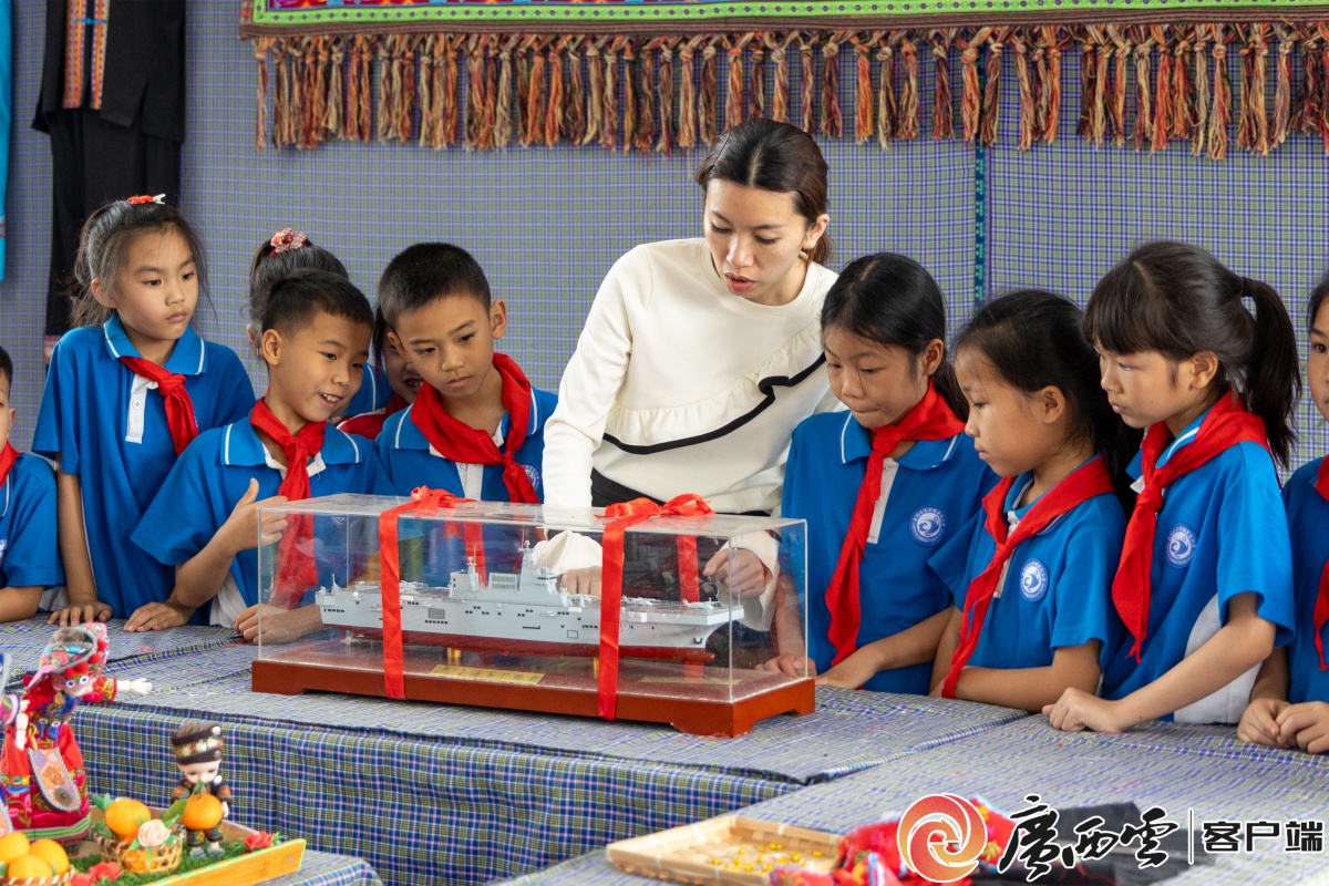今年年初,庆乐小学的少先队员代表登上广西舰,给广西舰官兵送祝福。广西舰 供图 此次带队的副校长李红兰回校后,专门开展广西舰主题讲座,结合官兵赠送的广西舰模型,向同学们介绍战舰概况以及独特的广西舰舰徽内涵,大家听得十分投入。“我想做海军”“我也要保家卫国”……这样的理想与向往,在校园里悄然传递。