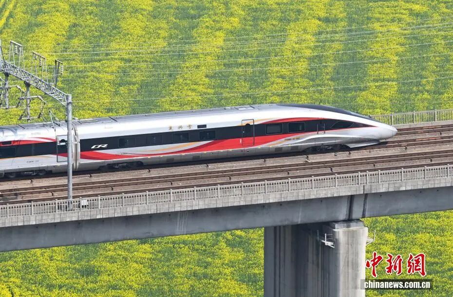 资料图:复兴号列车从油菜花田附近驶过。王刚 摄