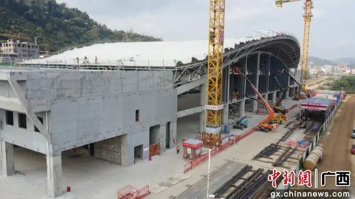近日,南珠高铁玉岑段岑溪东站建设全面进入装修攻坚期。岑溪东站候车大厅各项施工有序展开,现场井然有序。截至目前,岑溪东站站台雨棚18段中已完成16段整体浇筑,占比88.9%;雨棚屋面防水及保护层施工完成55%。
