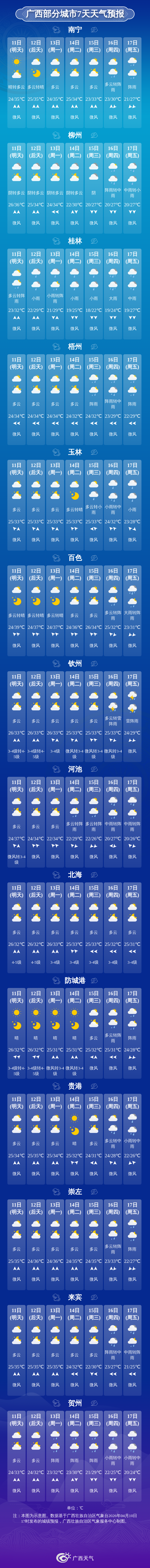 未来三天,各地最高气温:桂西、桂南大部34~37℃、局地38℃以上,其它地区25~35℃。
