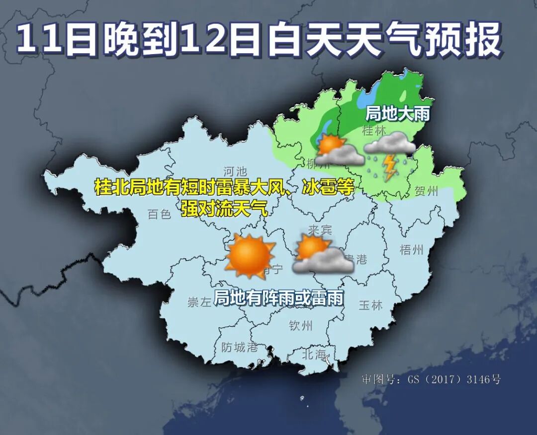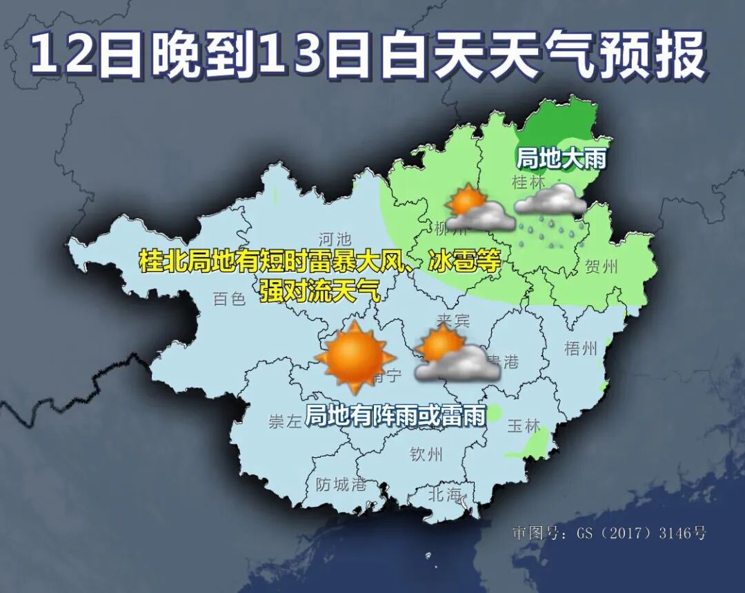 11日晚上到13日白天,桂东北多云到阴天有阵雨或雷雨、局地大雨,其它地区晴间多云、局地有阵雨或雷雨。桂北局地有短时雷暴大风、冰雹等强对流天气。
