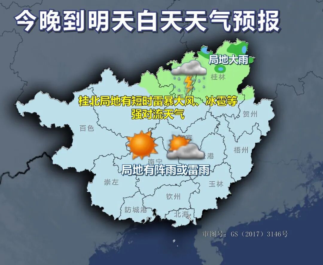 今天晚上到明天白天,桂林、柳州两市及河池东部有阵雨或雷雨、局地大雨,其它地区晴间多云、局地有阵雨或雷雨。桂北局地有短时雷暴大风、冰雹等强对流天气。桂西、桂南部分地区午后有5~6级、阵风7~8级的偏南大风。