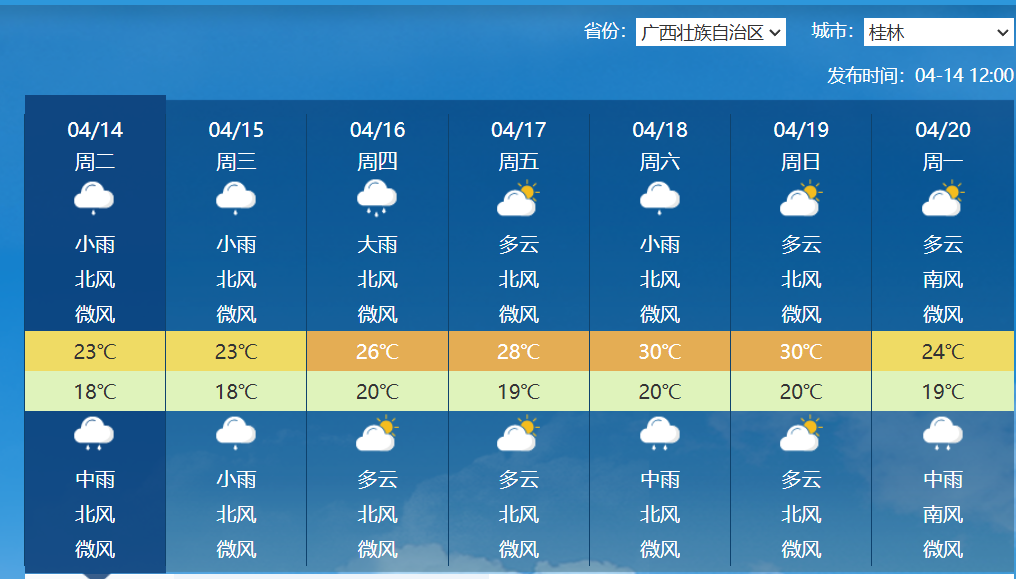 15日晚上到16日白天 桂东、桂南一带雨水渐起 有中到大雨、局地暴雨 并伴有短时雷暴大风、冰雹等强对流天气 其它地区多云到阴天 有分散阵雨或雷雨 桂林市未来几日天气预报 ↓↓