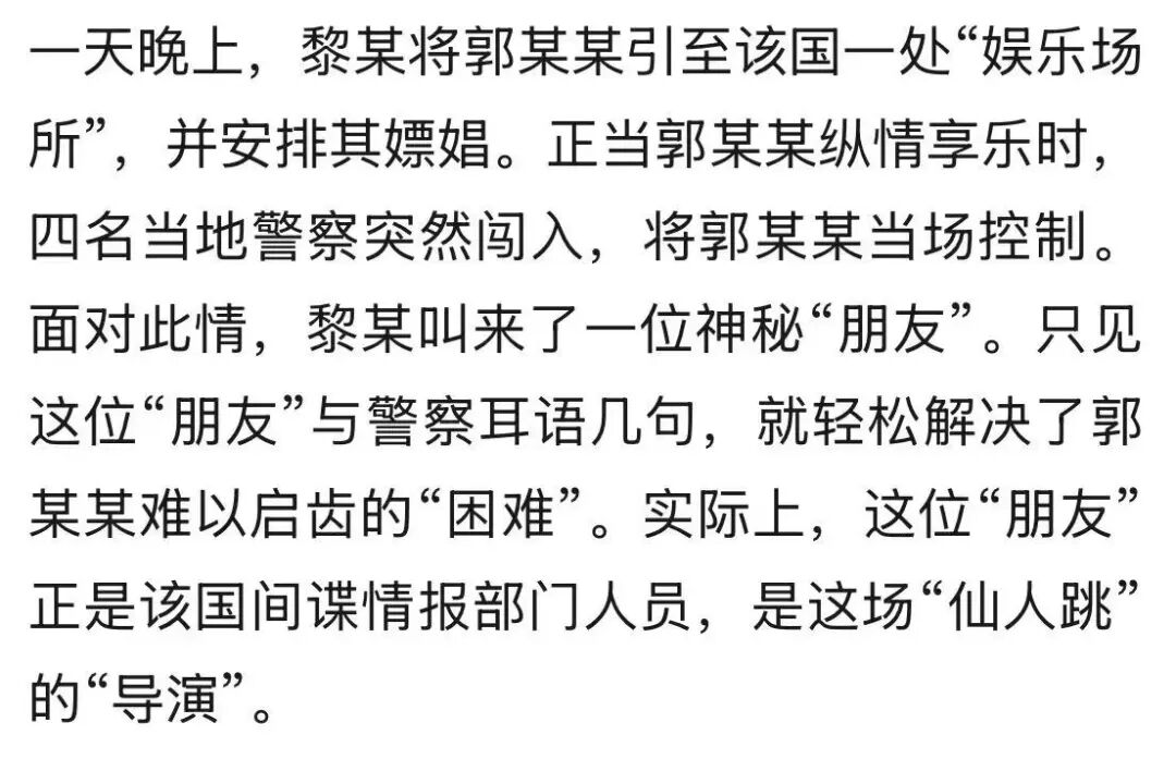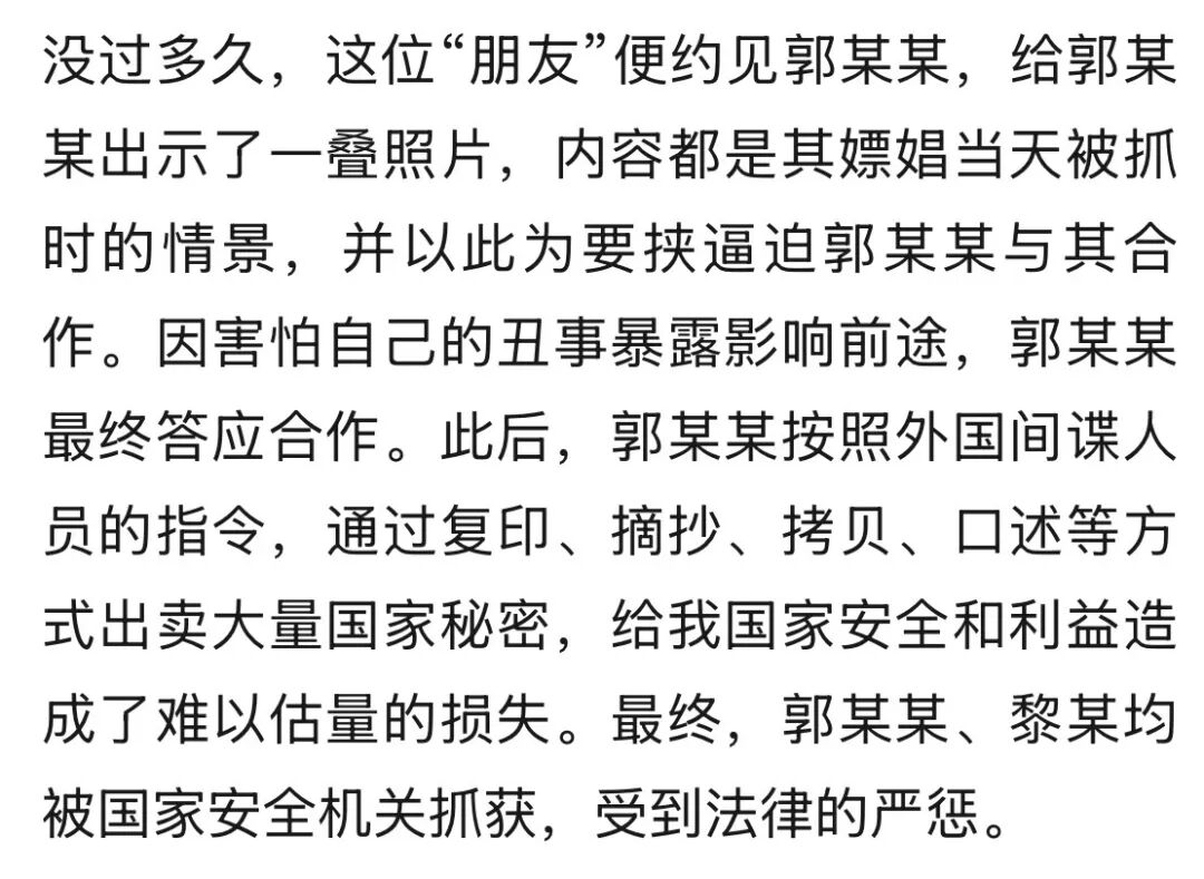 4月15日,国家安全部微信公众号发布文章《真实案例 | 驻外人员郭某某落入境外间谍布设的“桃色陷阱”,因担心事情败露而被策反》,全文如下: