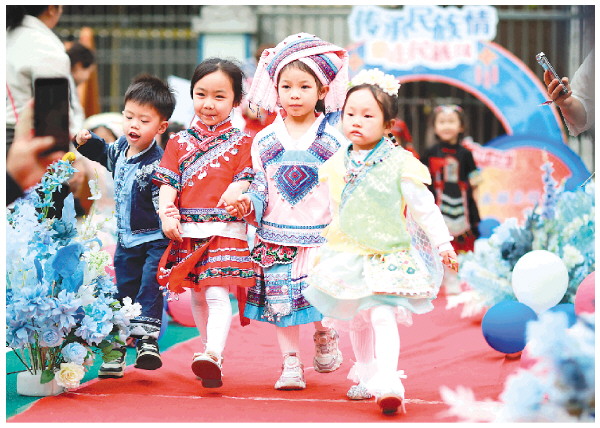4月15日,永福县幼儿园举办“七彩三月三 民族秀华章”民俗亲子活动,孩子们在家长、老师陪伴下,身着民族服饰体验民俗、品尝美食。