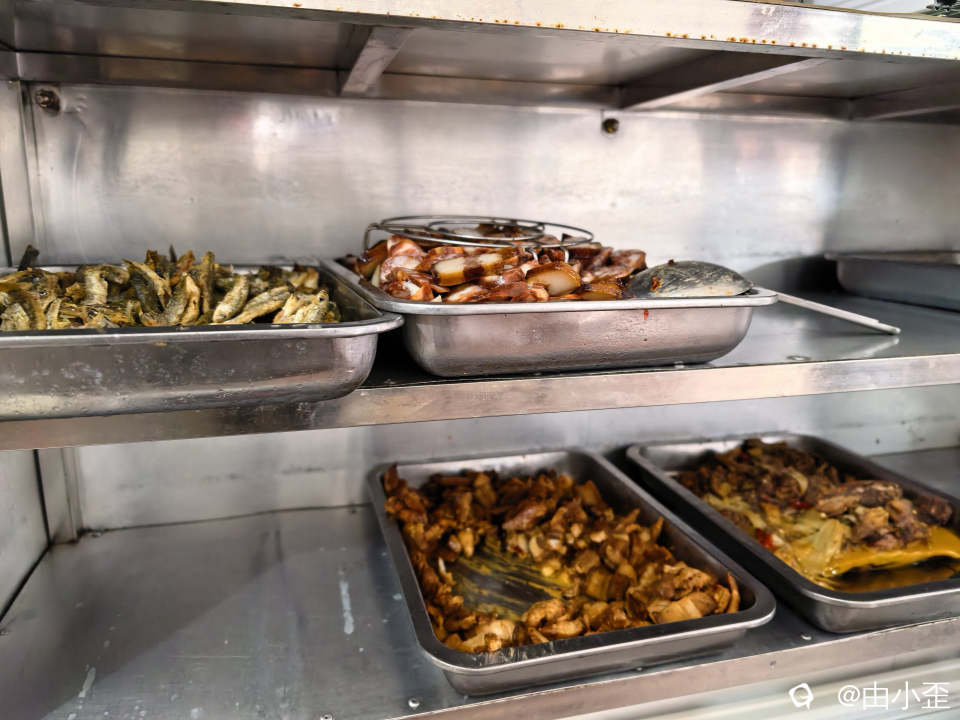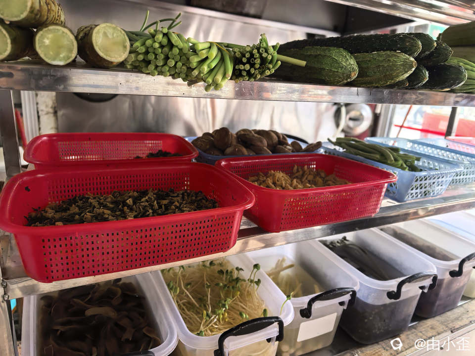 我们走进饭馆,看着架子上的食材,有什么就点什么。😋
