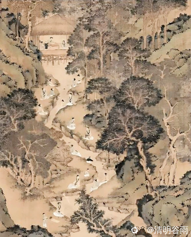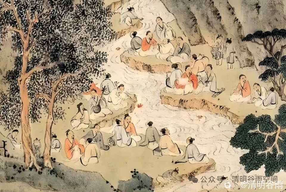 诗写“莫春三月日重三”的上巳节,兴安文人人在江渠水边祓禊祈福、踏青游春。诗中的“城南风浴”,暗合《兰亭集序》“浴乎沂,风乎舞雩”的典故。这天的修禊地在崇山峻岭之间,满目茂林修竹,流波溪水潺潺,诗人对自然环境的描述表达了人与自然融为一体的闲适情怀。