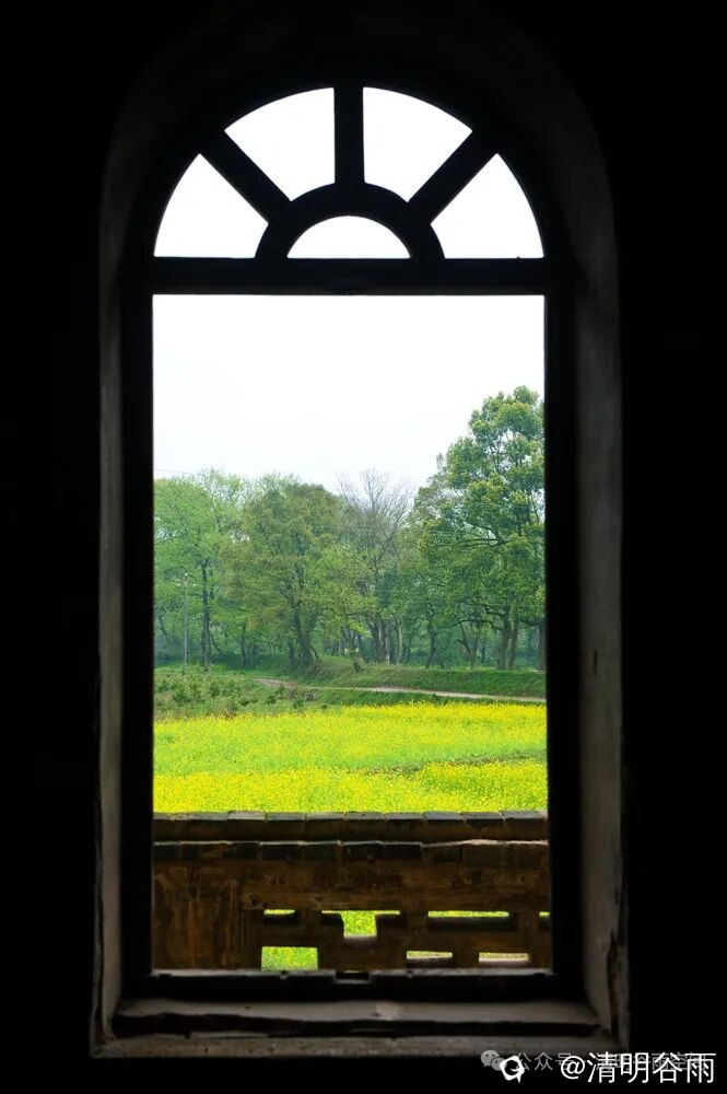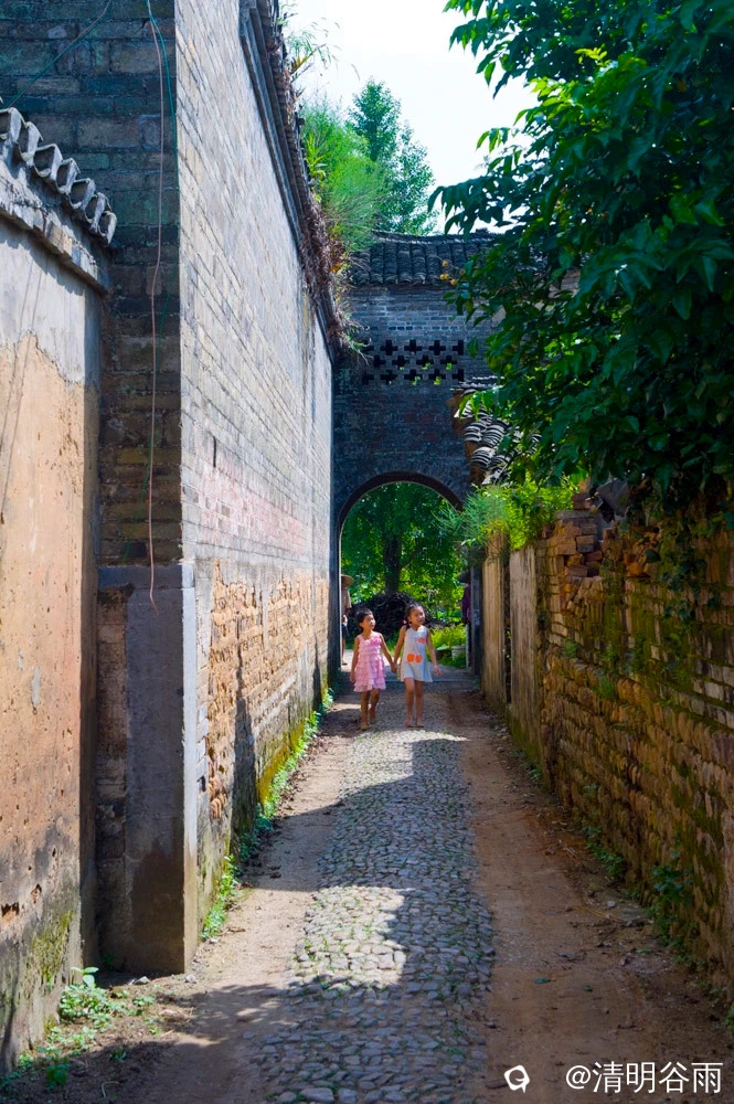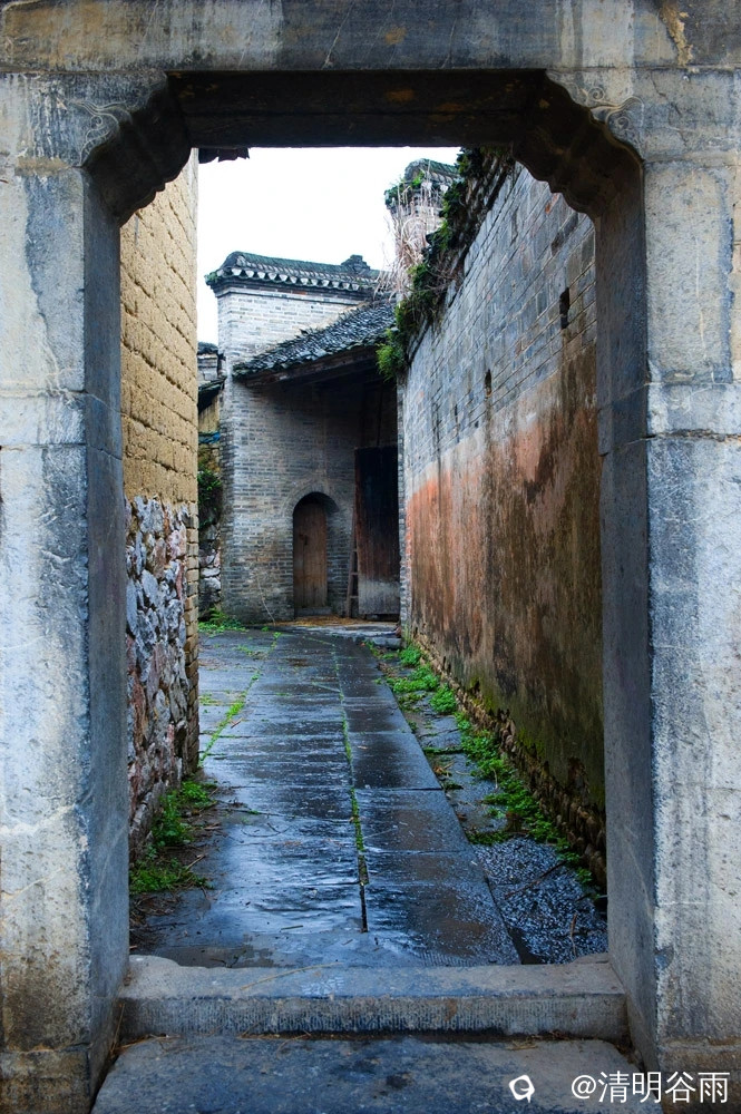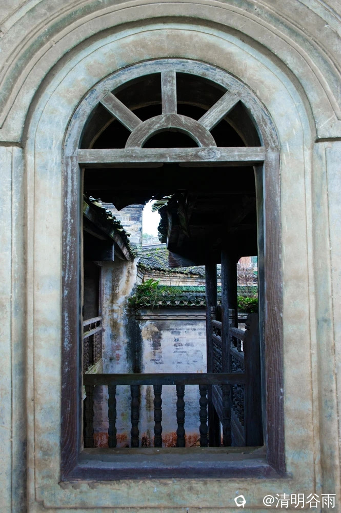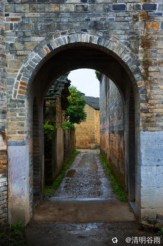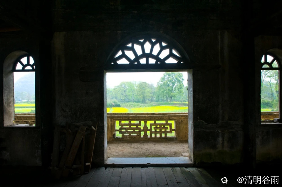春天走进堡里村,那由七块巨大条石架成的古石板桥依旧平卧在河面上,过桥是古村,村中老屋有青砖房,有土砖房,贫富分明。沿着卵石街巷左转是蒋家大院,面积1500多平方。大院建筑为典型的桂北青砖黛瓦马头墙民居,院中有青石板铺成的过道,通过两道青砖拱门,是一座建于民初的两层楼房,这是一栋具有较高水准的民国时代建筑。楼房外部造型为西式风格,青砖外墙白灰抹面,内部则为木结构楼阁,楼阁前面和左右两边有三个中式青石天井。左右天井后边各有楼梯通二层,楼上二层为厅房,没有间隔,开有对称排列的十二个拱形窗口,宽敞明亮。厅房中间一道拱形大门通往窗口外长长的廊道,在廊道上凭栏眺望小河、田野、远山,有无尽的春光。