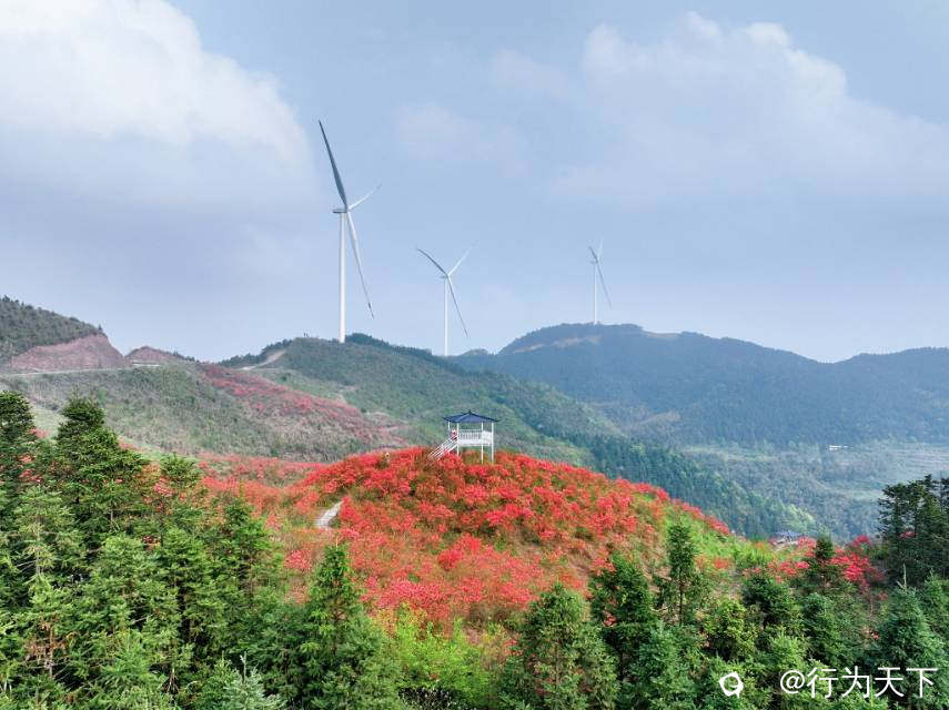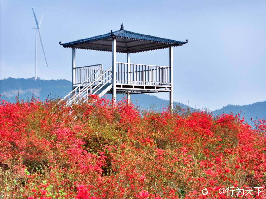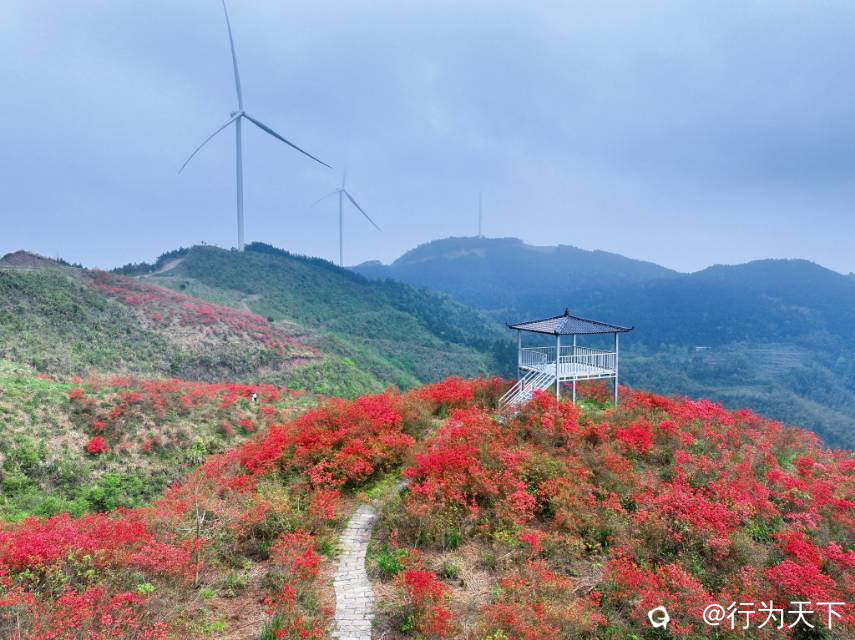 极目远眺,远处的山峰连绵起伏,层层叠叠向天际延伸,青黛色的山峦若隐若现,像一幅淡雅悠远的水墨长卷。 近景是热烈如火的杜鹃,中景是缓缓转动的风车,远景是层峦叠嶂的青山,层次分明,意境悠远,让人瞬间沉醉在这山野间的诗情画意里。