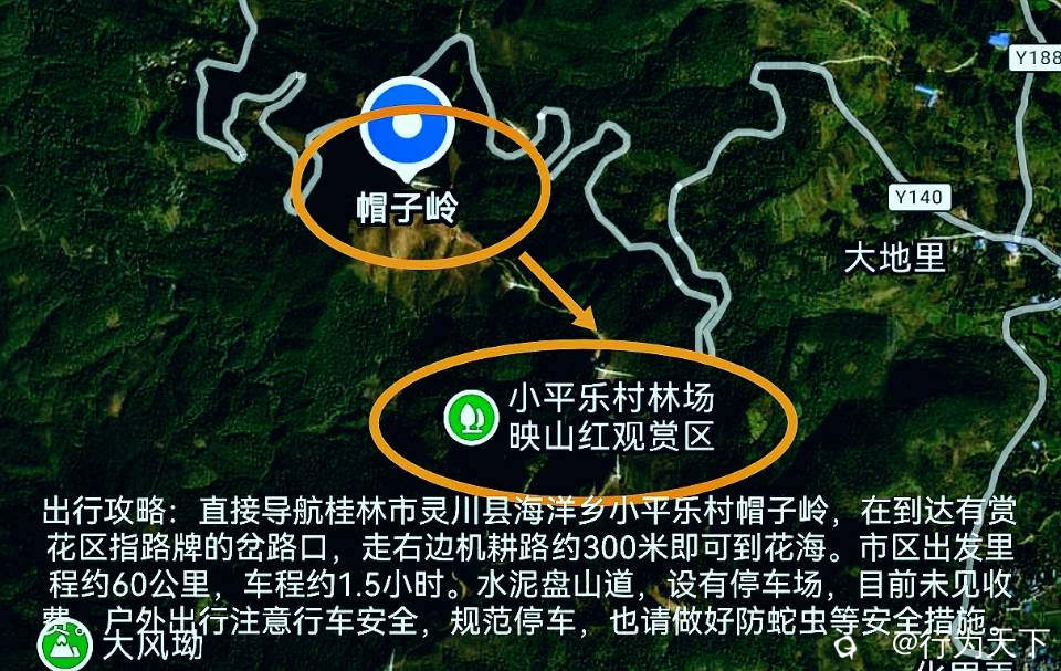 出行攻略:直接导航桂林市灵川县海洋乡小平乐村帽子岭,在到达有赏花区指路牌的岔路口,走右边机耕路约300米即可到花海。 市区出发里程约60公里,车程约1.5小时。水泥盘山道,设有停车场,目前未见收费。 户外出行注意行车安全,规范停车,也请做好防蛇虫等安全措施。游览高山美景,也请爱护环境,让心灵与山水同美。