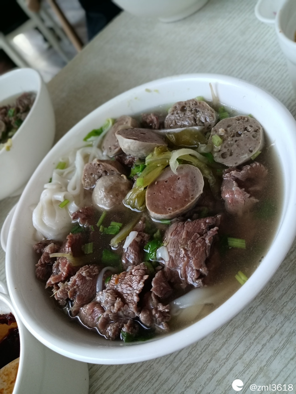 牛肉面。下到汤里的鲜牛肉 ,烫得仅有多少分熟?有点红红的,夹生,他们告诉我 ,要的就是这效果,口感好,这样才能感受到牛肉的鲜嫩。