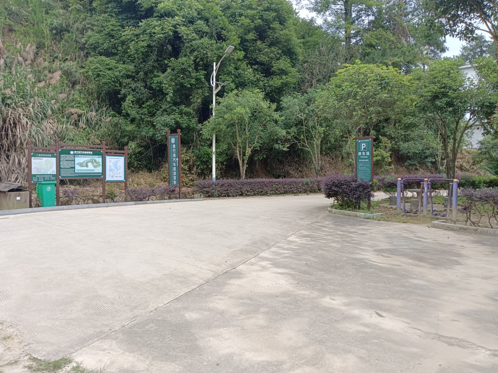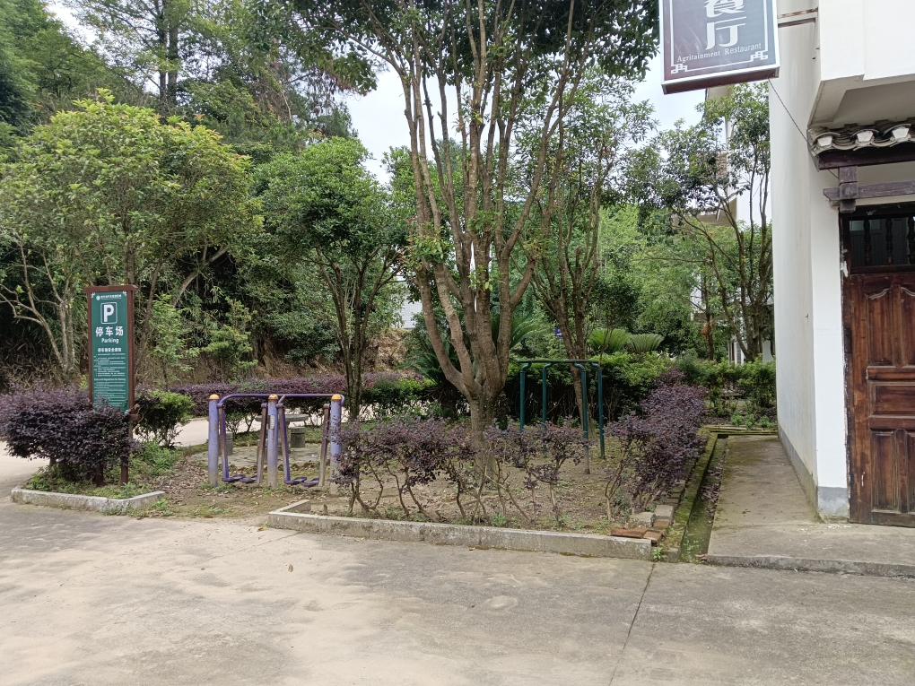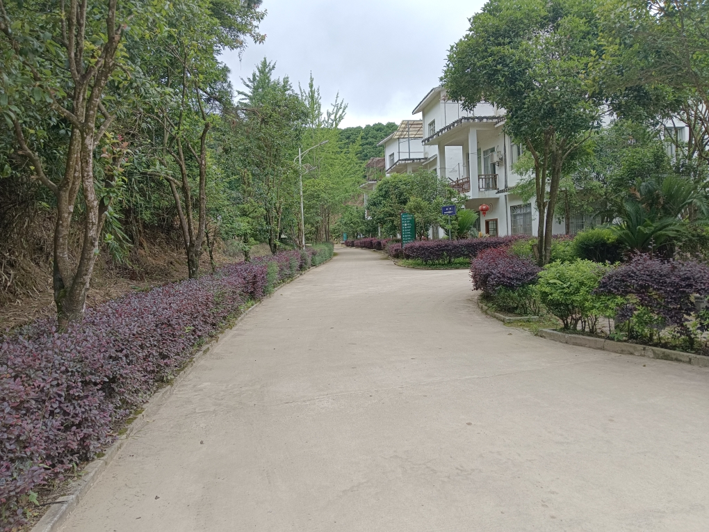 在培训大楼的左后方,有一条石板镶嵌的小径一直婉延向后山上,山顶上建有一座观景凉亭。凉亭二楼上视野开阔,向西俯瞰,可见黄竹岗移民村的全貌……