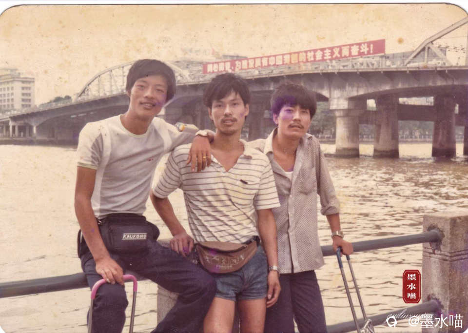 我小舅跟他的小伙伴们一起去广州进货时拍的照片(后面广州海珠大桥上的横幅“同心同德,为建设具有中国特色的社会主义而奋斗!”,真真是那个时代的真实写照!)
