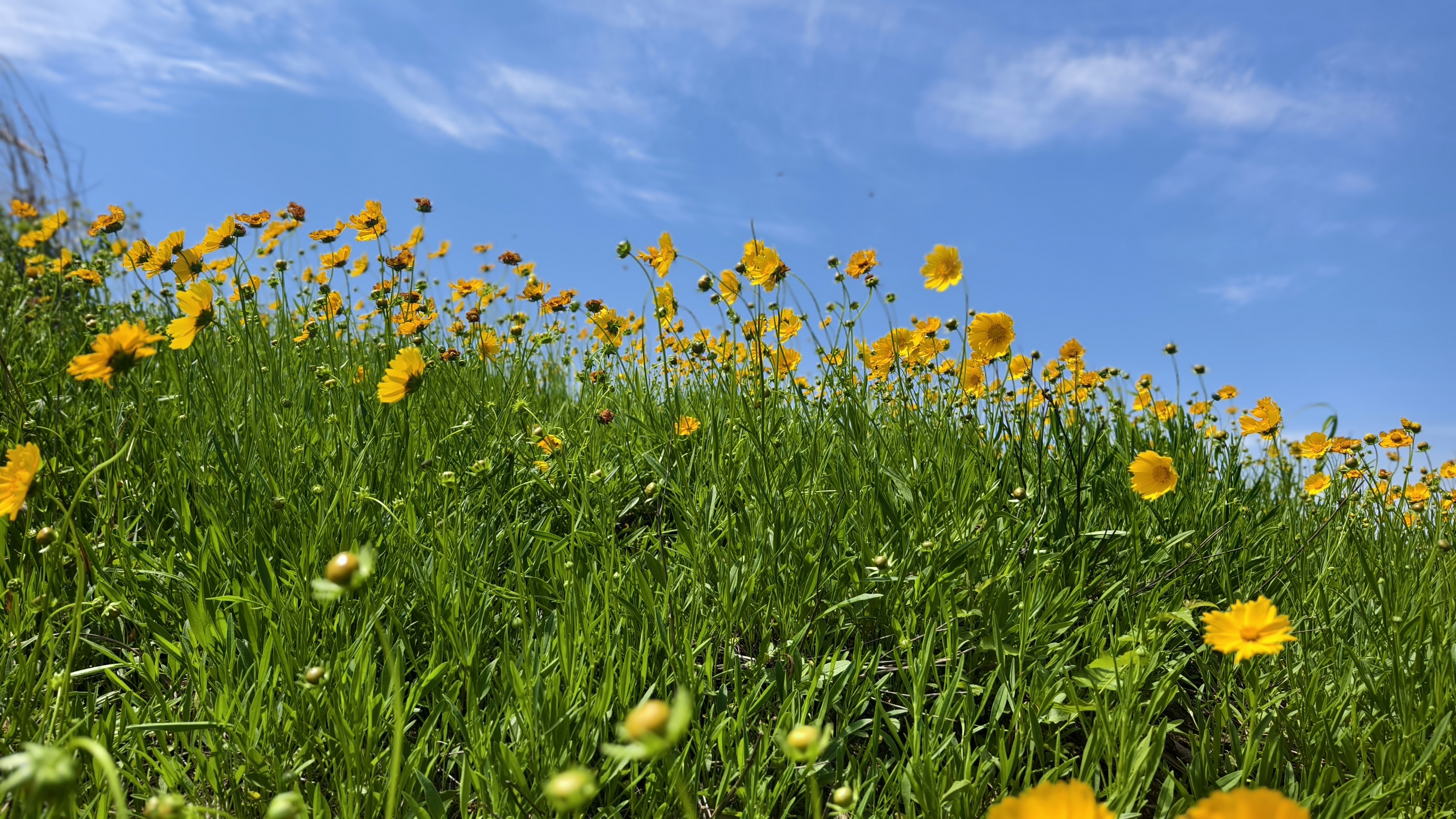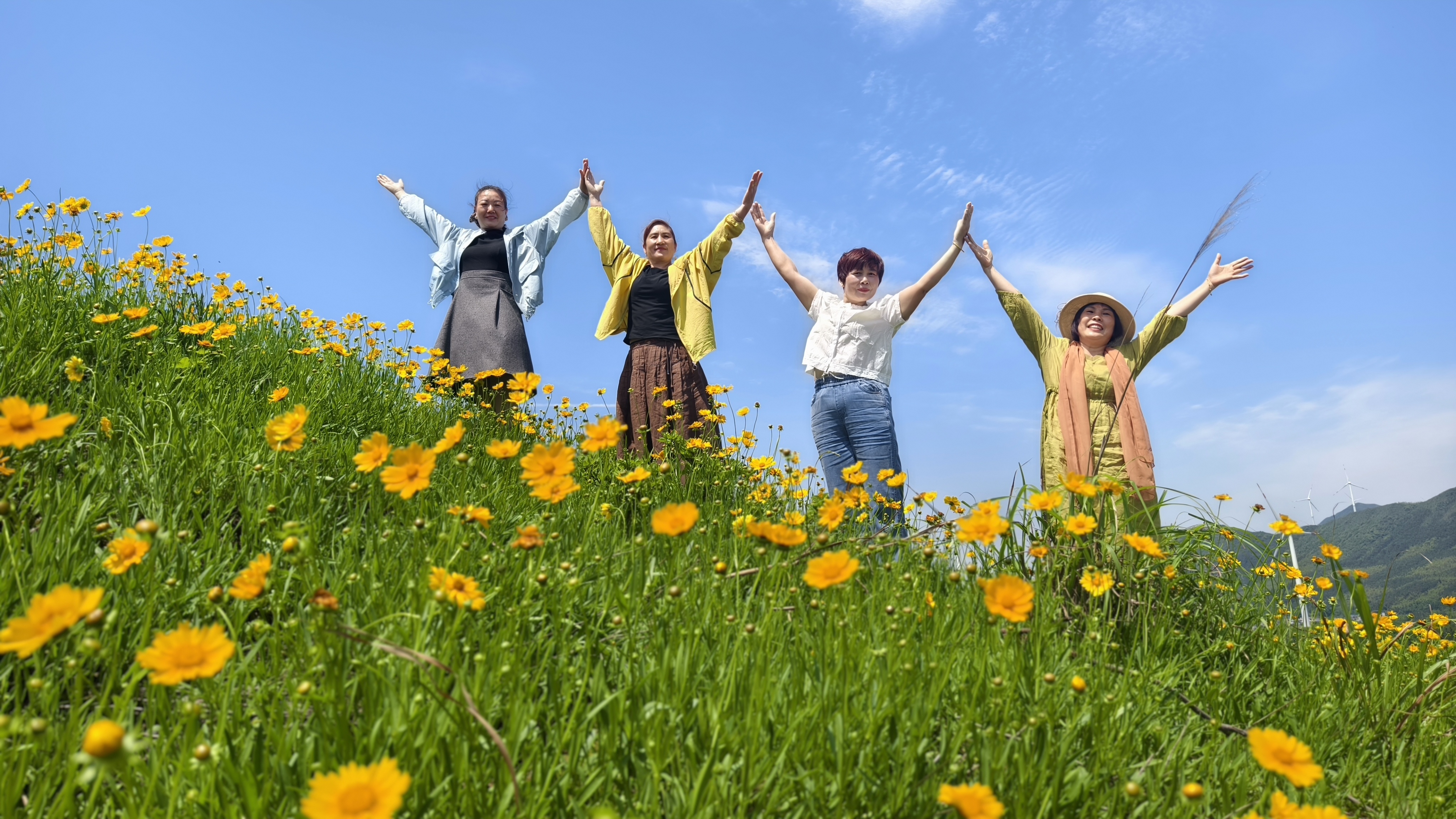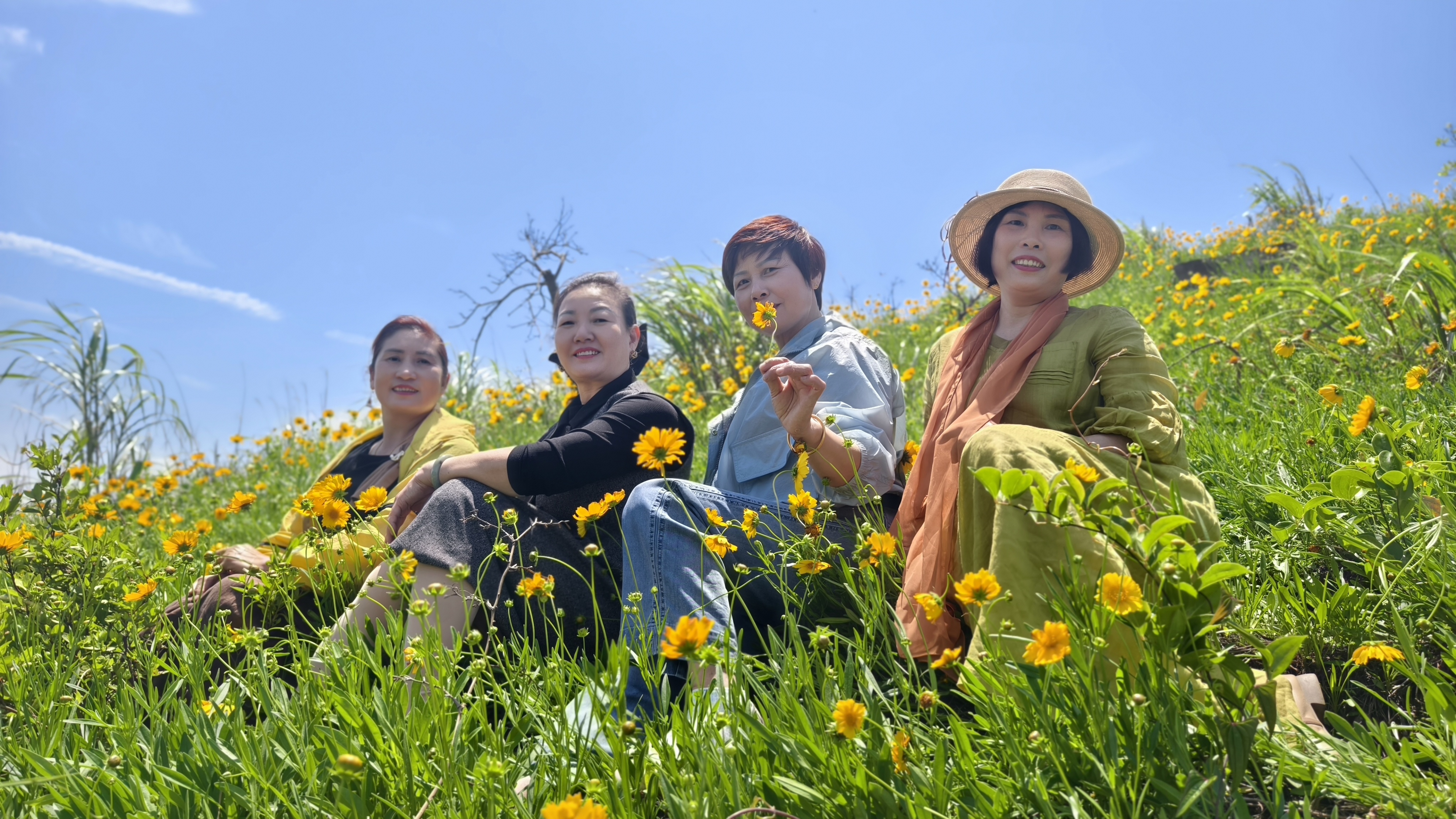 小黄花灿烂绽放,就像是在巨大的绿毯上绣着朵朵金花,生机勃勃中透着温柔。一张张在天地间定格的照片快速生成:仰首展臂,笑靥如花,在阳光映照下格外和谐。
