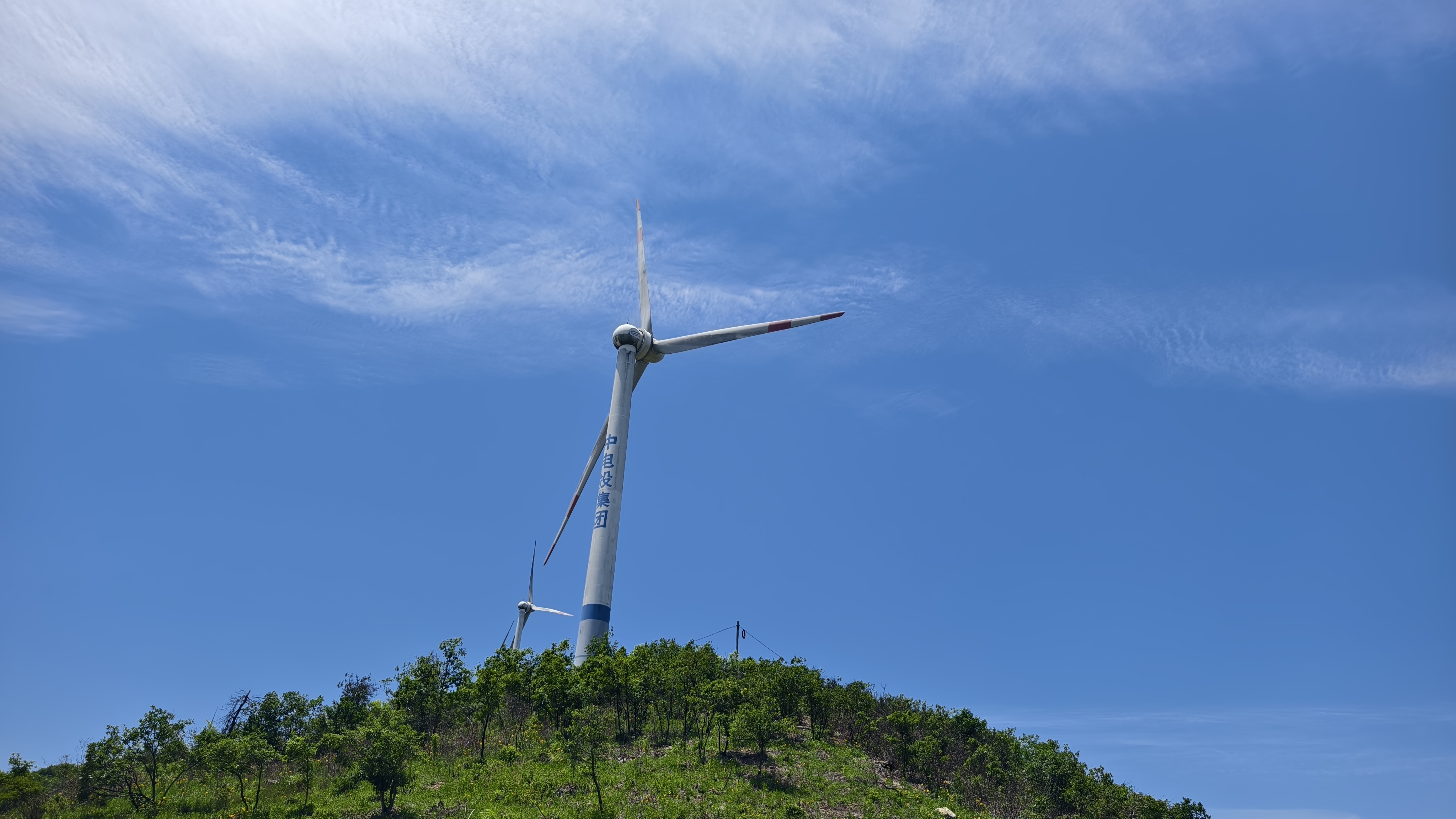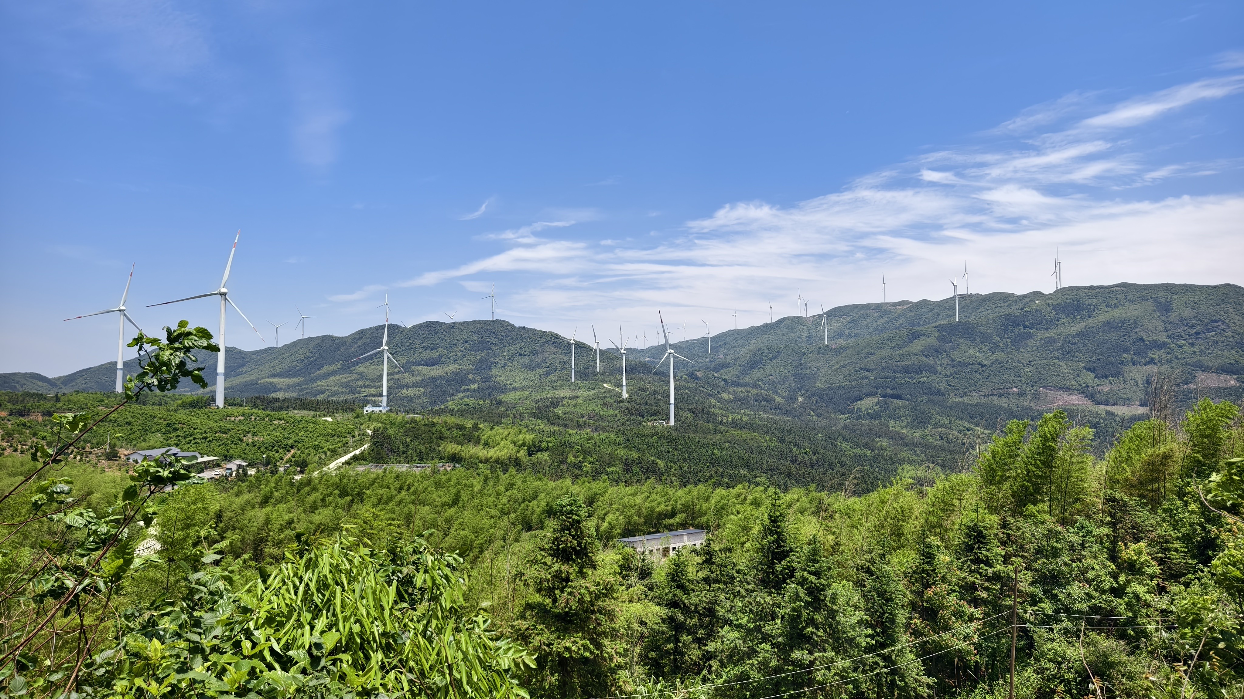 山坡上,极目远眺,连绵不断的山峦绿意葱茏,白色风车错落其间,近处,草木繁茂,生机盎然,自然与现代交融,绘就成一幅静谧而壮阔的画卷,令人心旷神怡。
