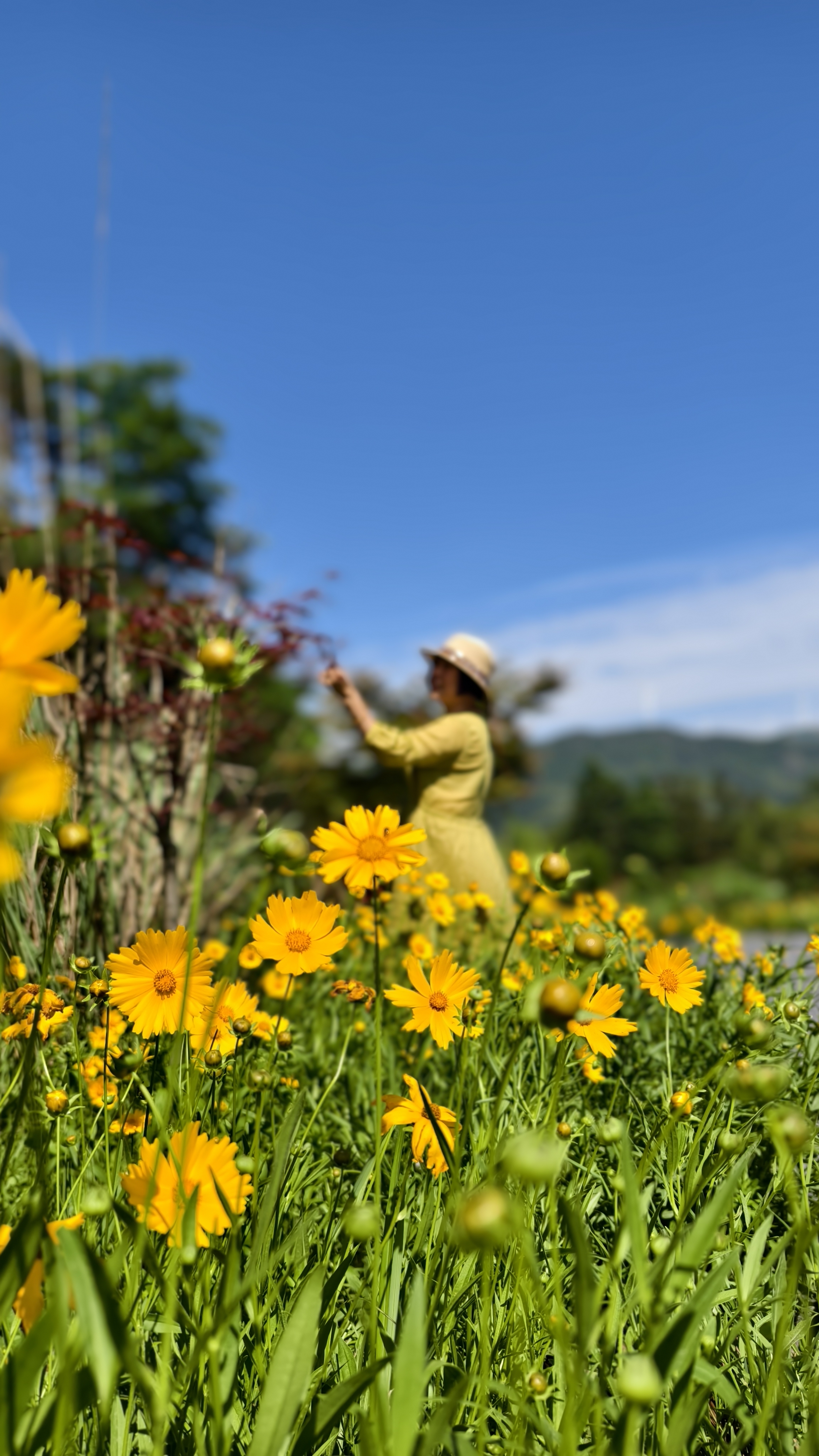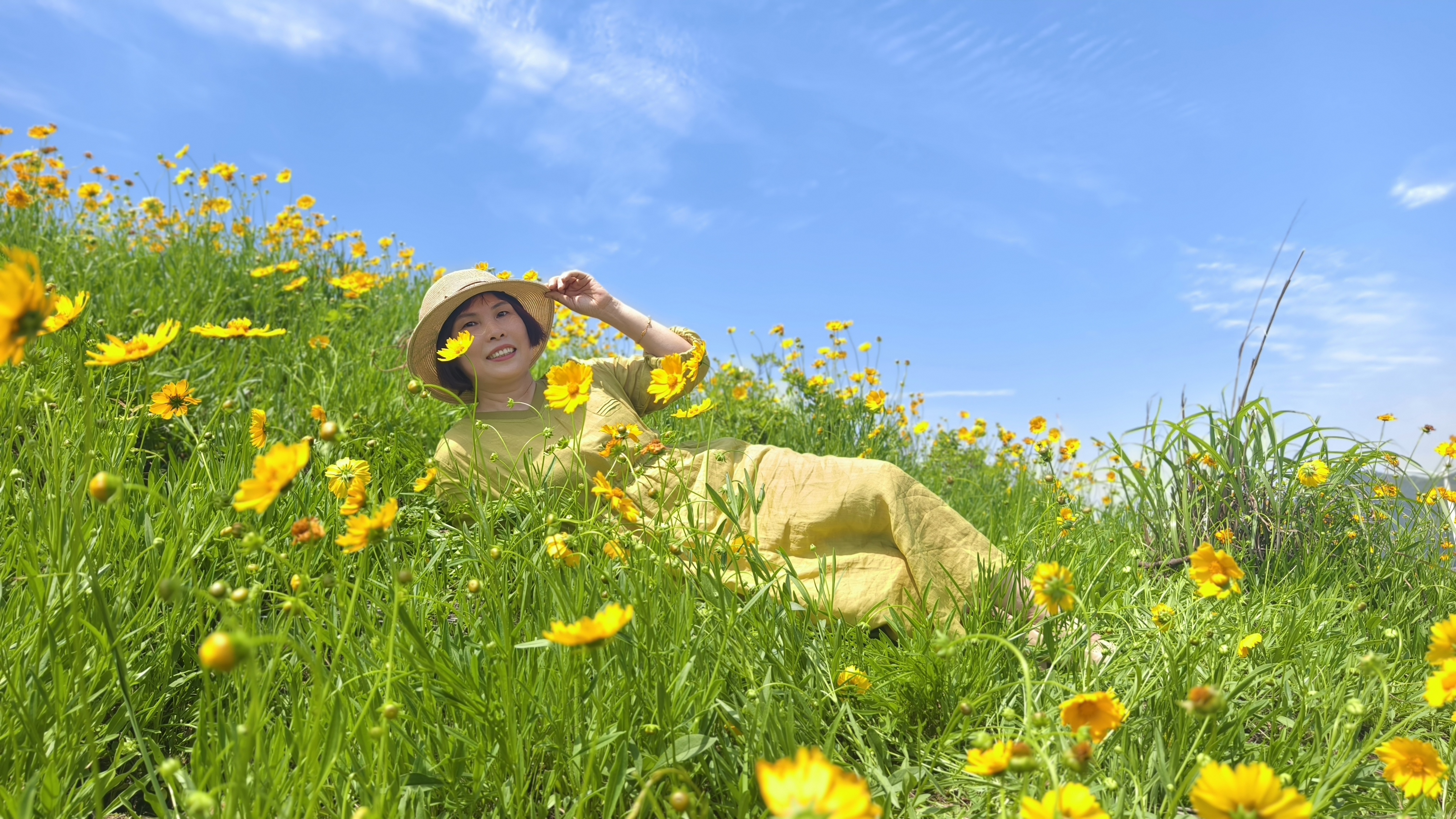 或卧或坐于花丛,黄衣与花色相衬,繁花簇拥,蓝天为幕,任时光在自然的怀抱里缓缓流淌,只留宁静与美好在一地金黄的山坡上。