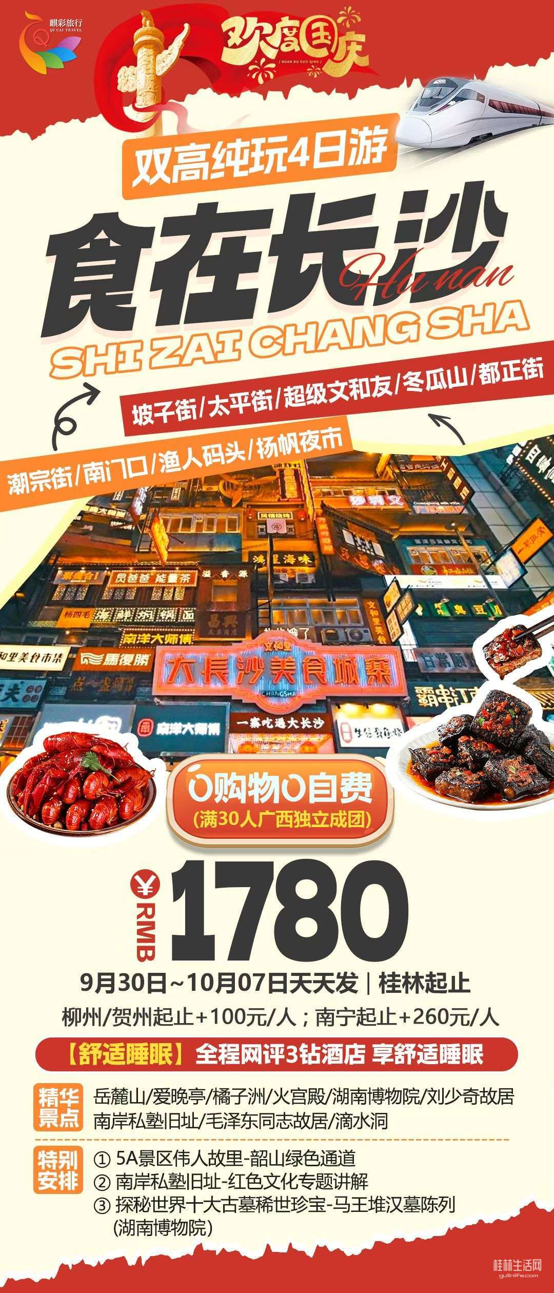 国庆-高铁长沙4天9月30日-10月7日天天发