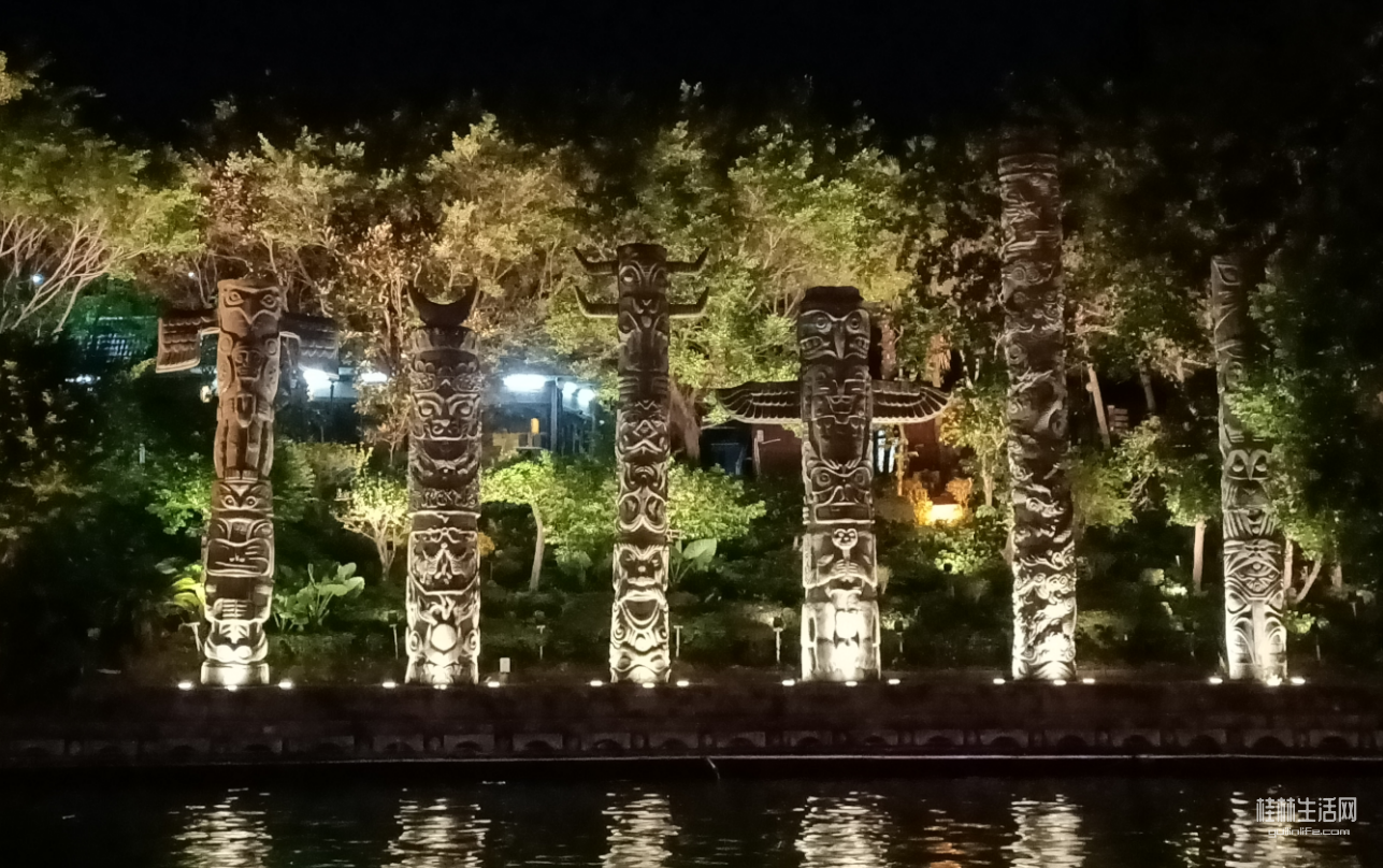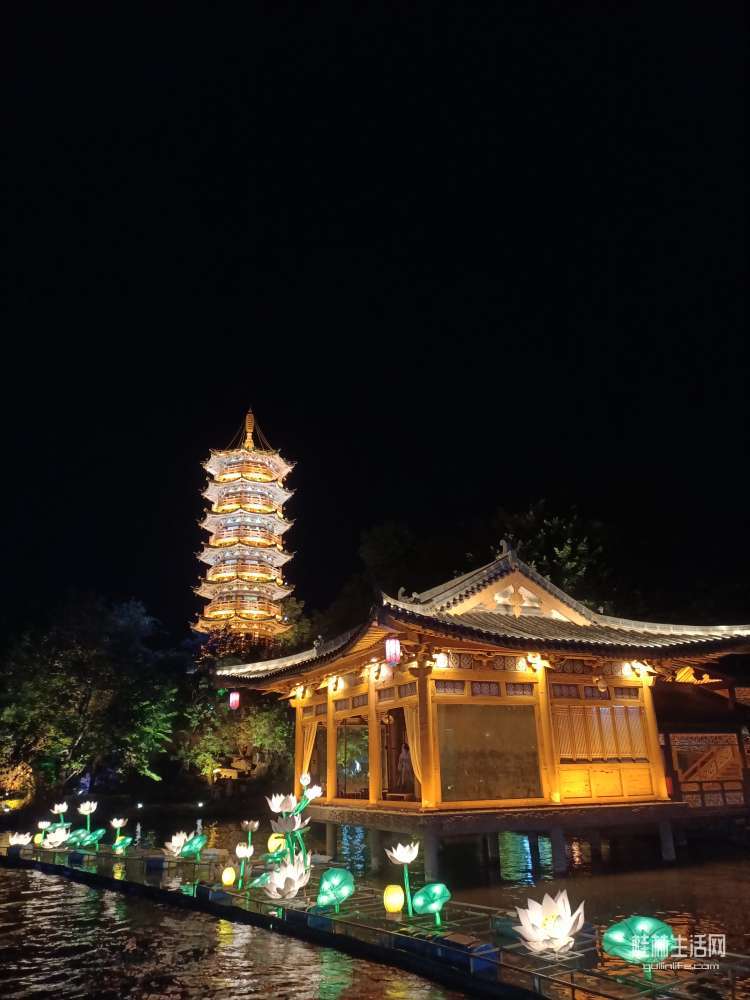 岸边七彩灯火投映水中,光影摇曳间,整座湖仿佛化作被打翻的琉璃盏,碎金流银,步步皆似仙境。