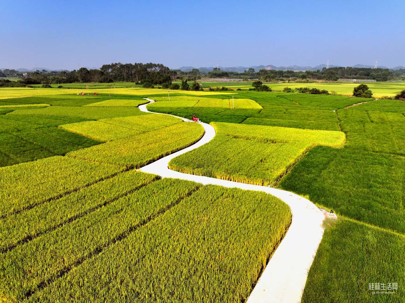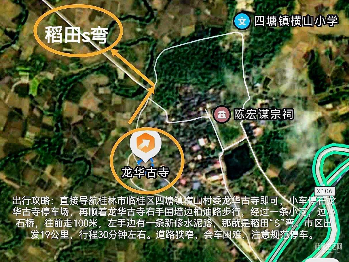 出行攻略:直接导航桂林市临桂区四塘镇横山村委龙华古寺即可,小车停在龙华古寺停车场,再顺着龙华古寺右手围墙边柏油路步行,经过一条小河,过小石桥,往前走100米,左手边有一条新修水泥路,那就是稻田“S”弯。