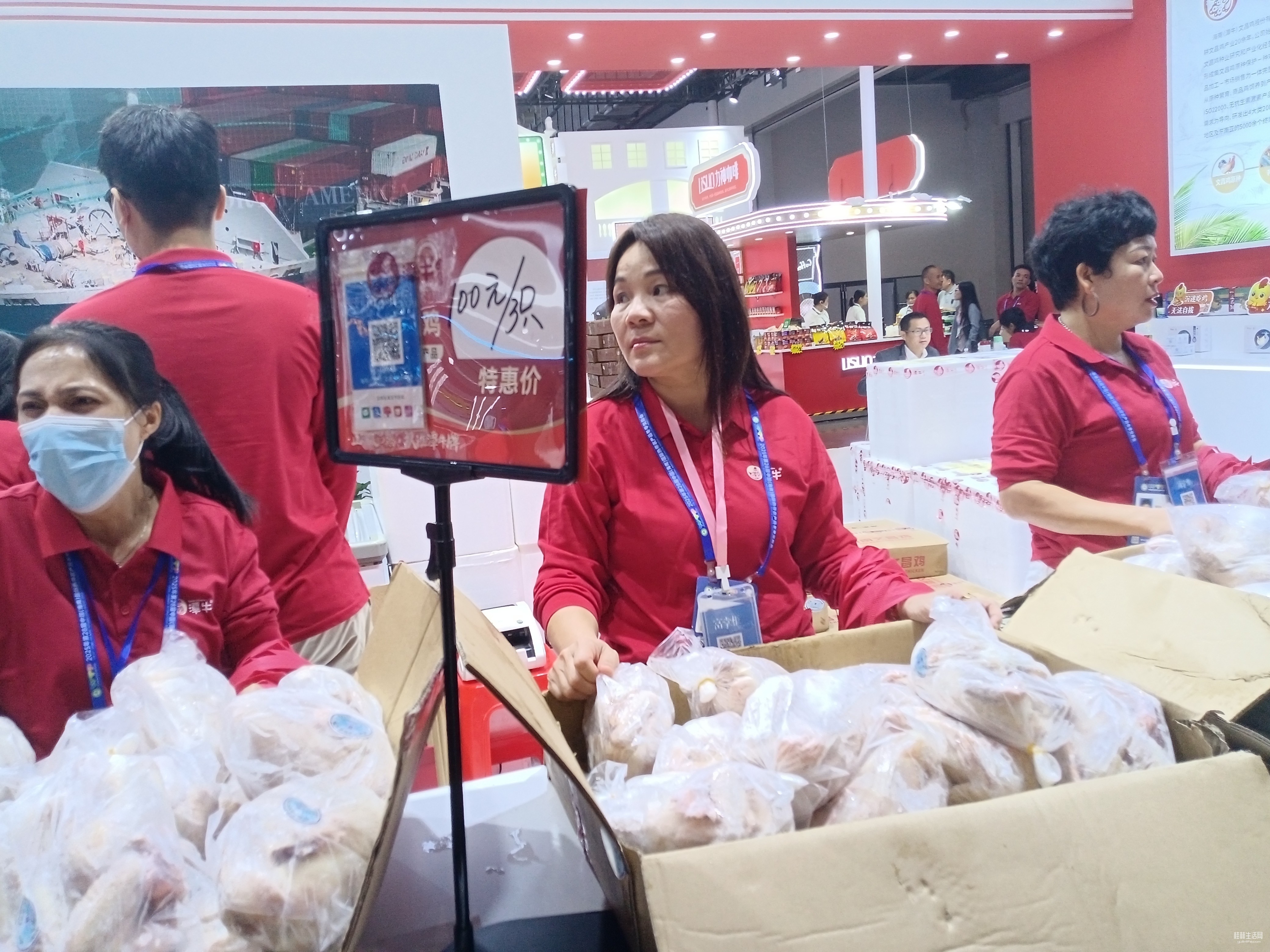 展台工作人员切了芒果让大家品尝,又香又甜,离开时,我果断买了一袋,花了20元。