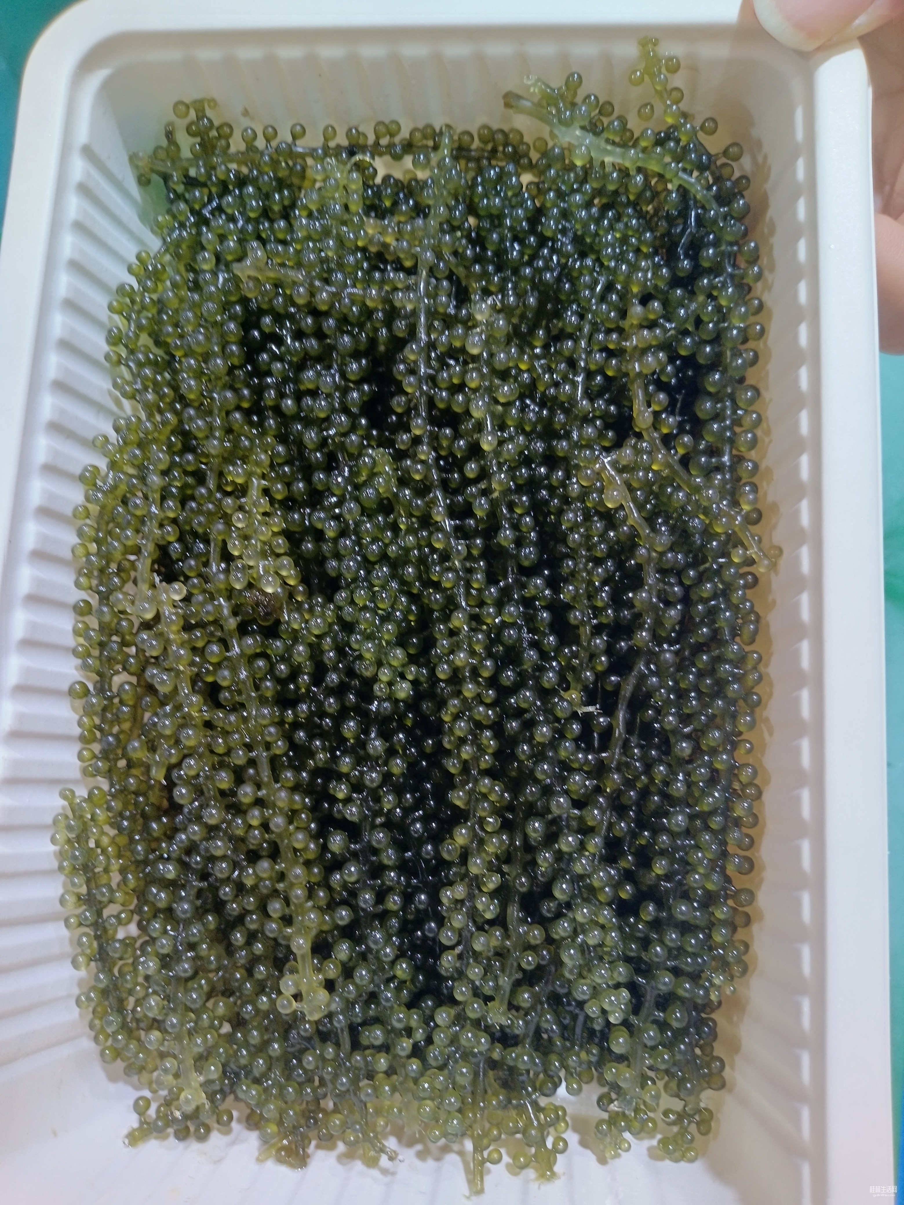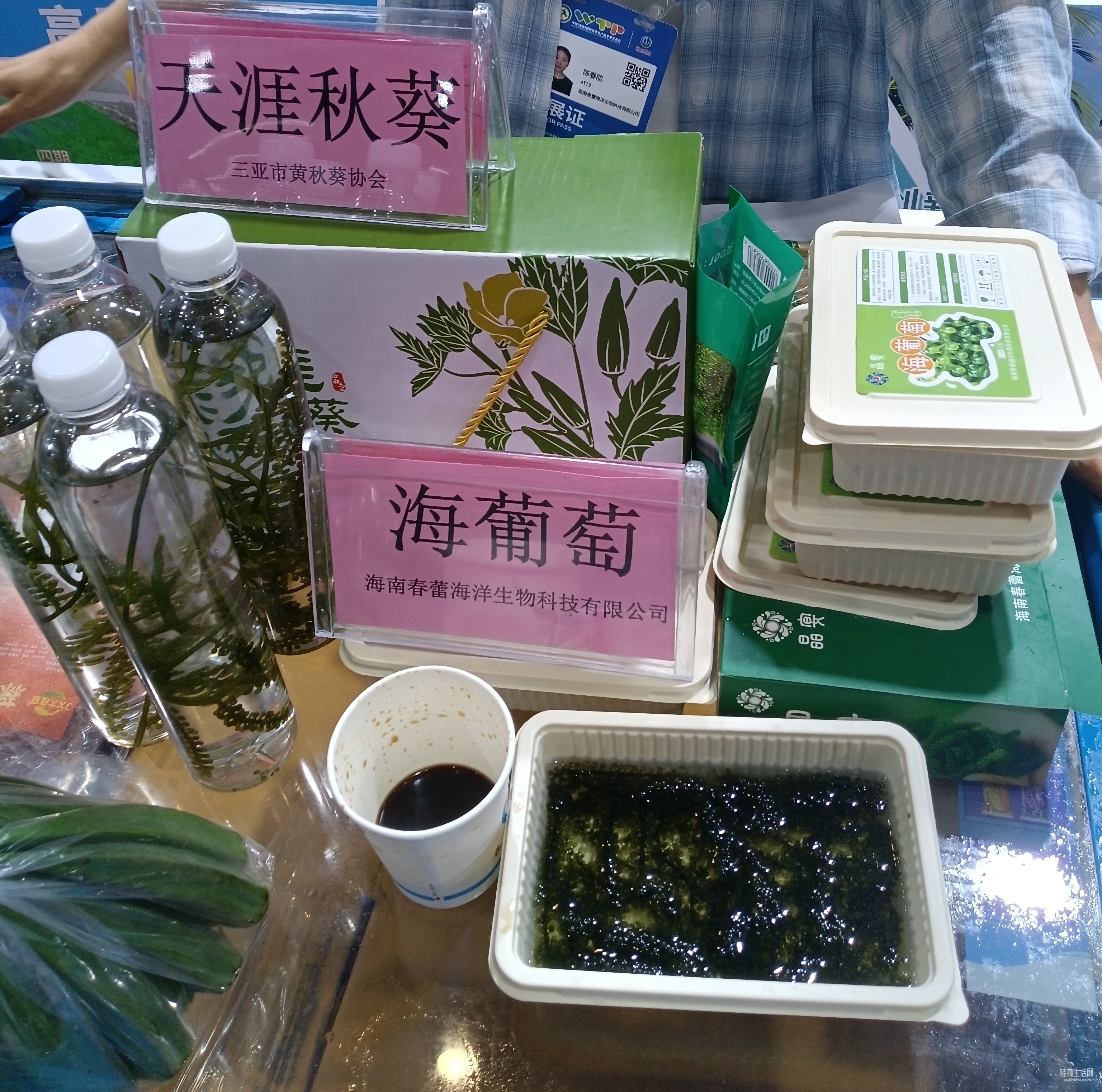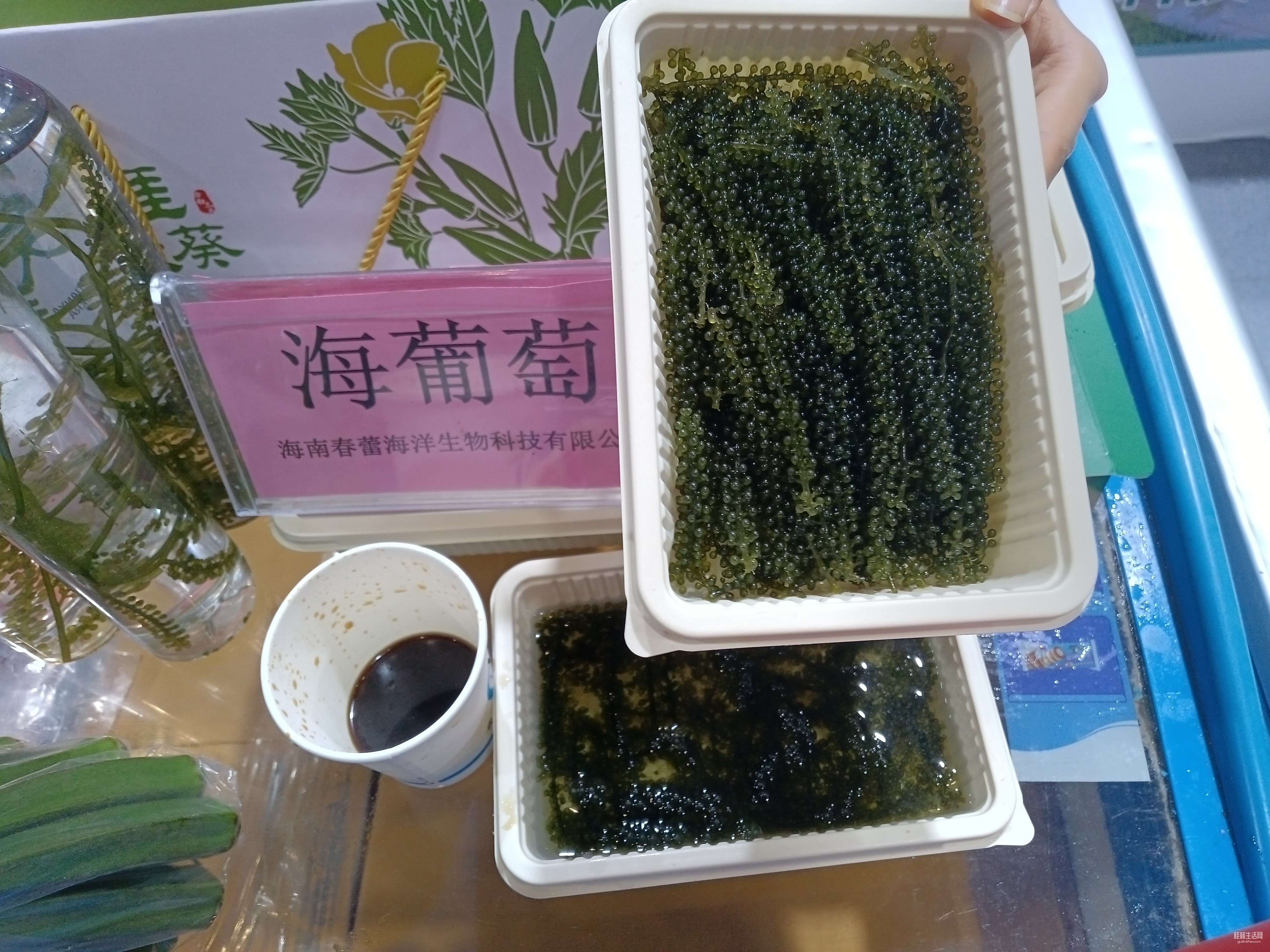 我是头一回看到海葡萄,展台女孩叫我品尝一下,这海葡萄,口感有点脆淡淡的咸味,不费牙,没有海蜇皮硬,用于凉拌。