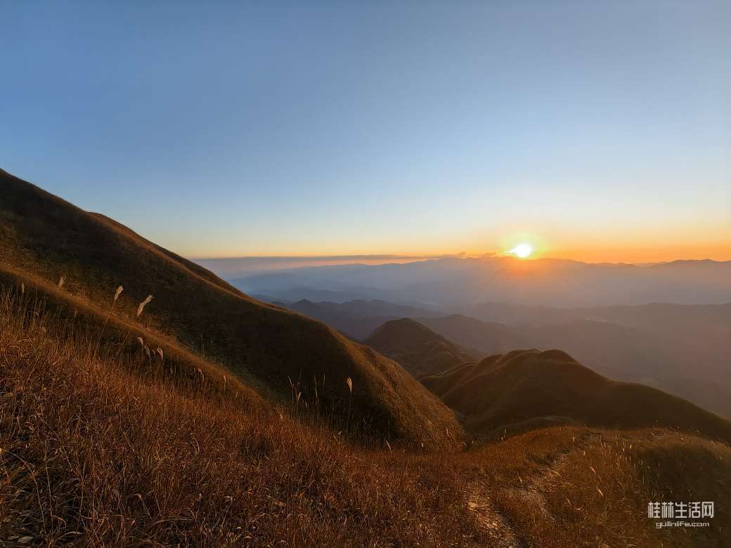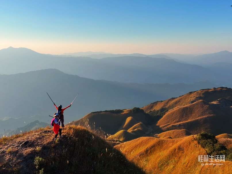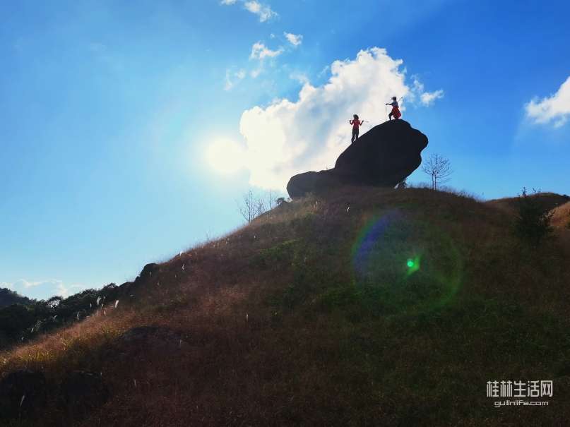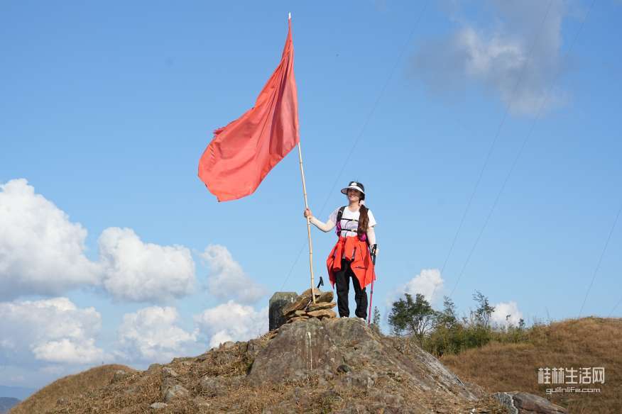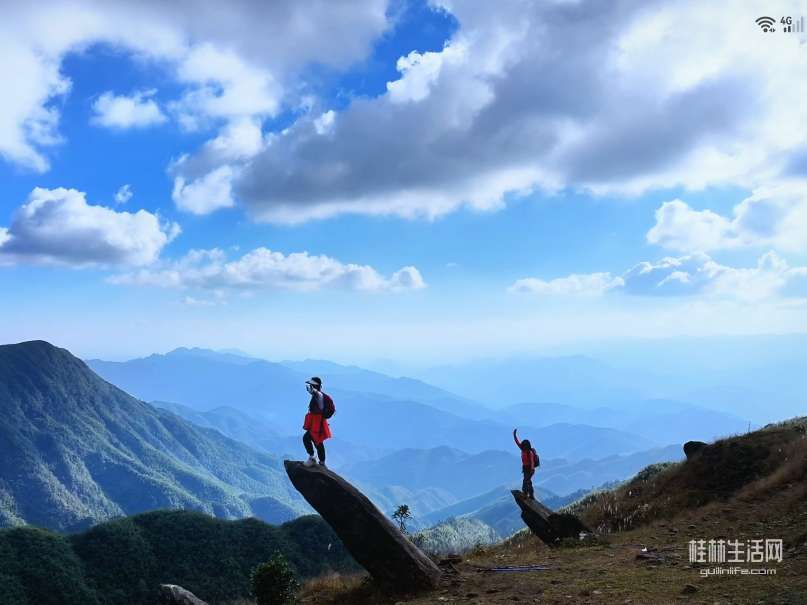 登顶远眺,临桂峰林若隐若现,灵川溪谷蜿蜒如带,三县风光在视野中交融成画。