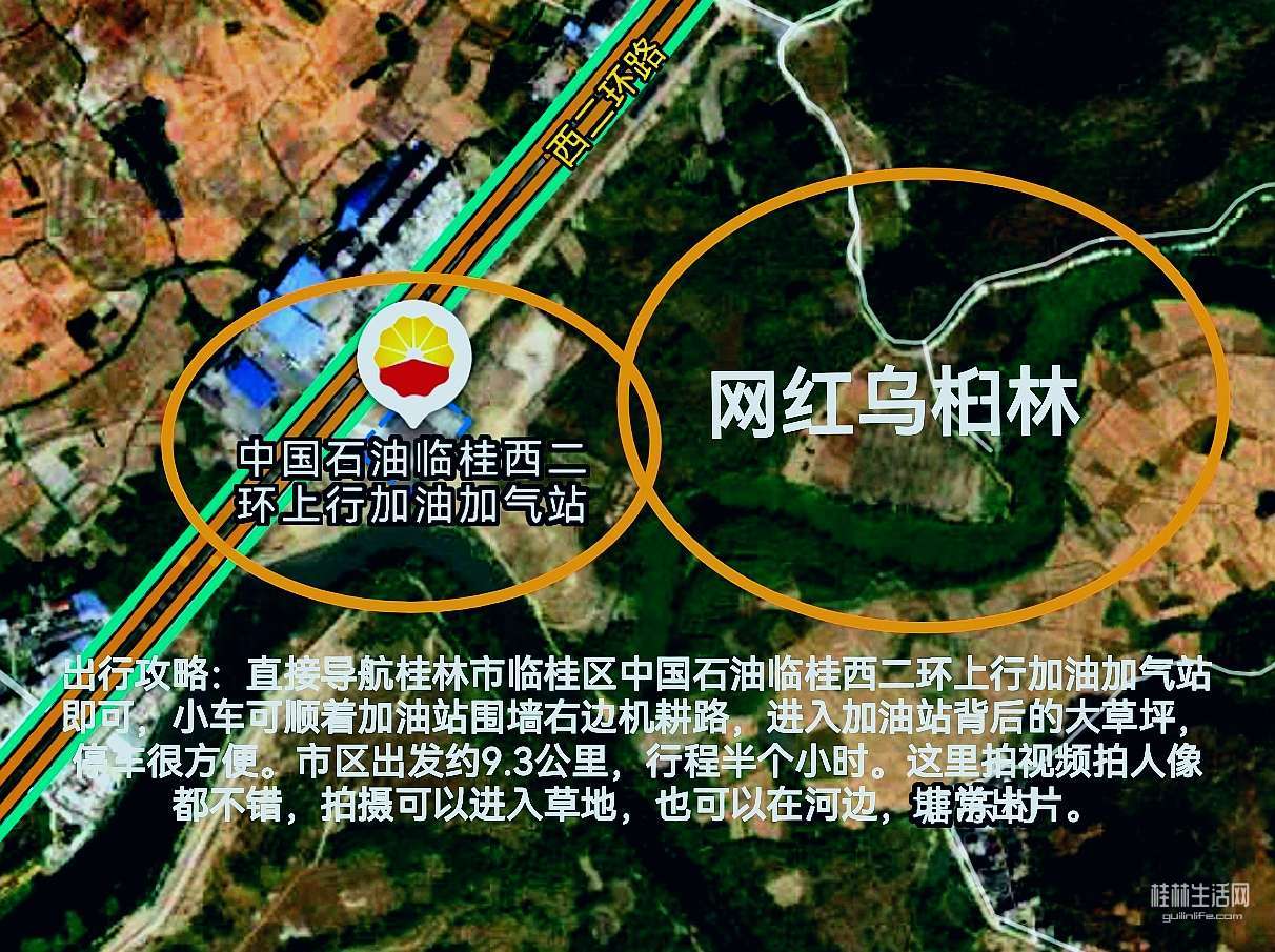 直接导航桂林市临桂区中国石油临桂西二环上行加油加气站即可,小车可顺着加油站围墙右边机耕路,进入加油站背后的大草坪,停车很方便。