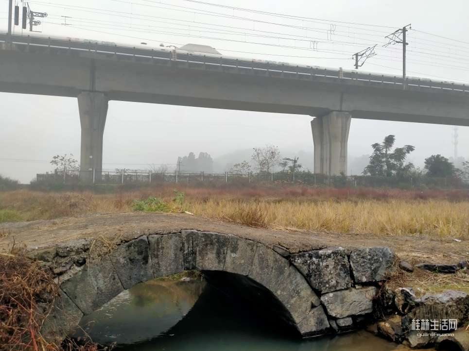从唐村继续沿田垌中水泥路东行,在宜湘河村北几百米,刚刚穿过铁路高架桥,一座石拱桥映入眼帘。