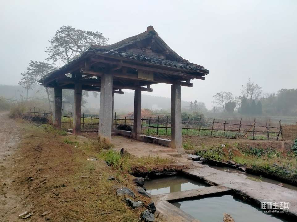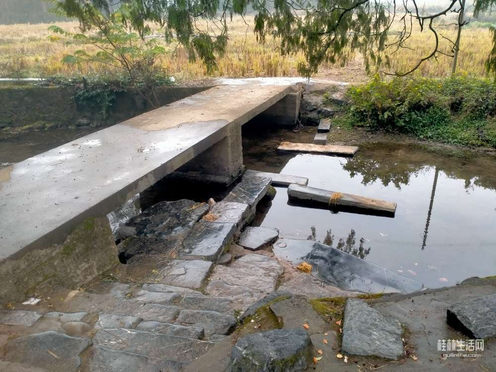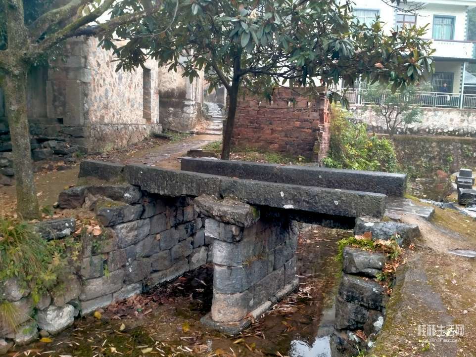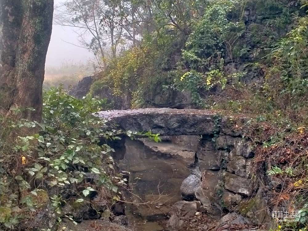 弄屋村的石山底下一条涌泉,出山洞拐了一个180度的大弯,这里有一座亮眼的石板桥,从桥墩上粗糙的石梁伸臂来看,长条石栏是后加的。
