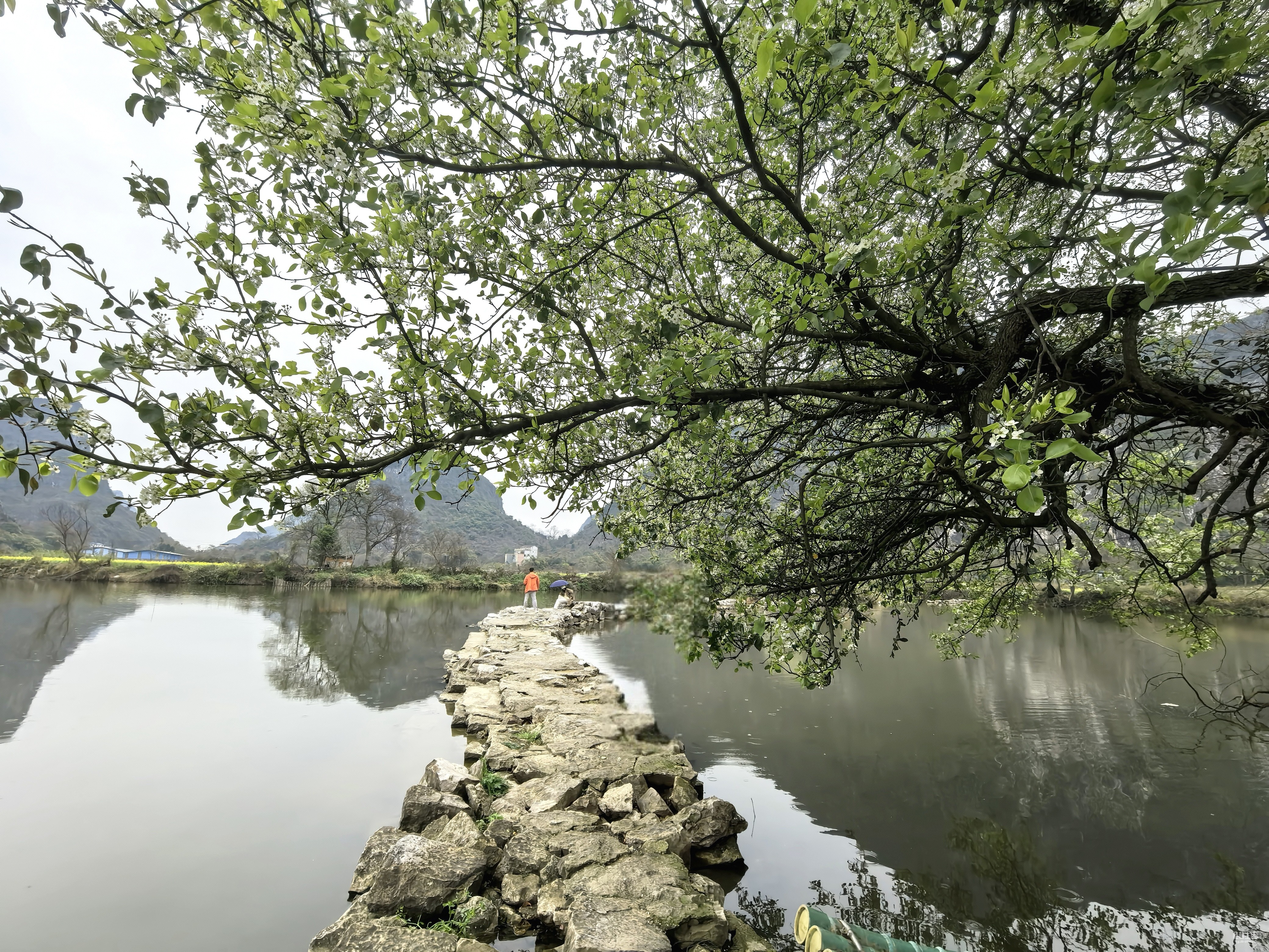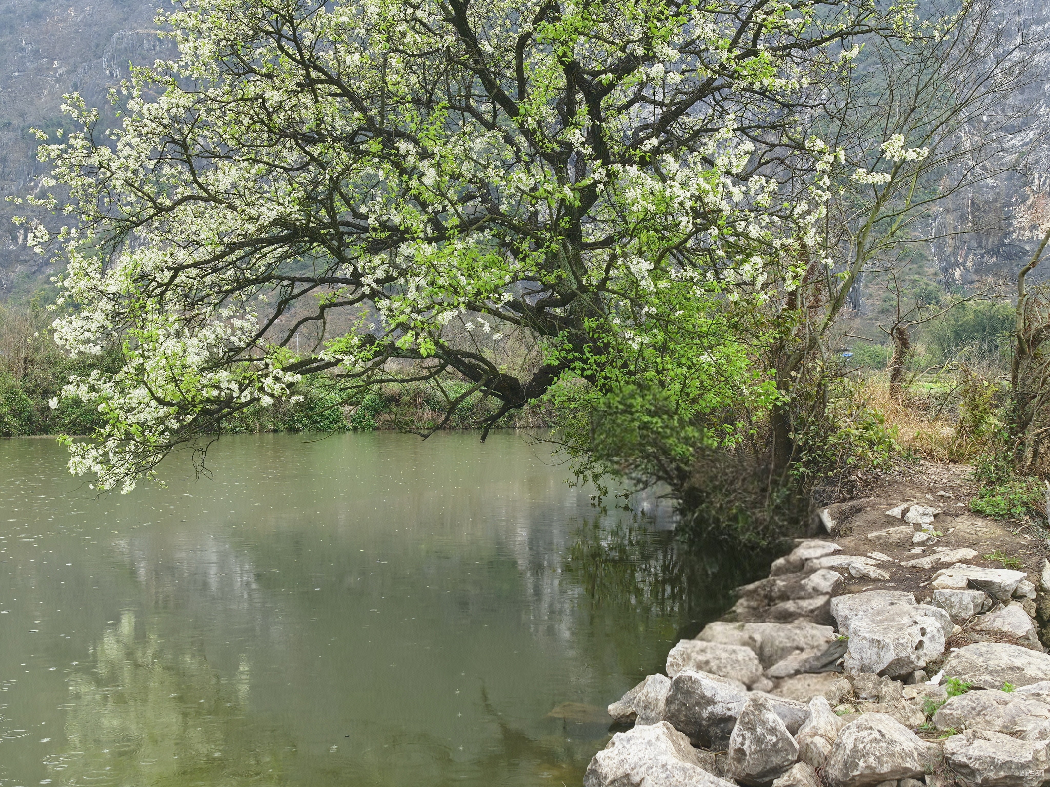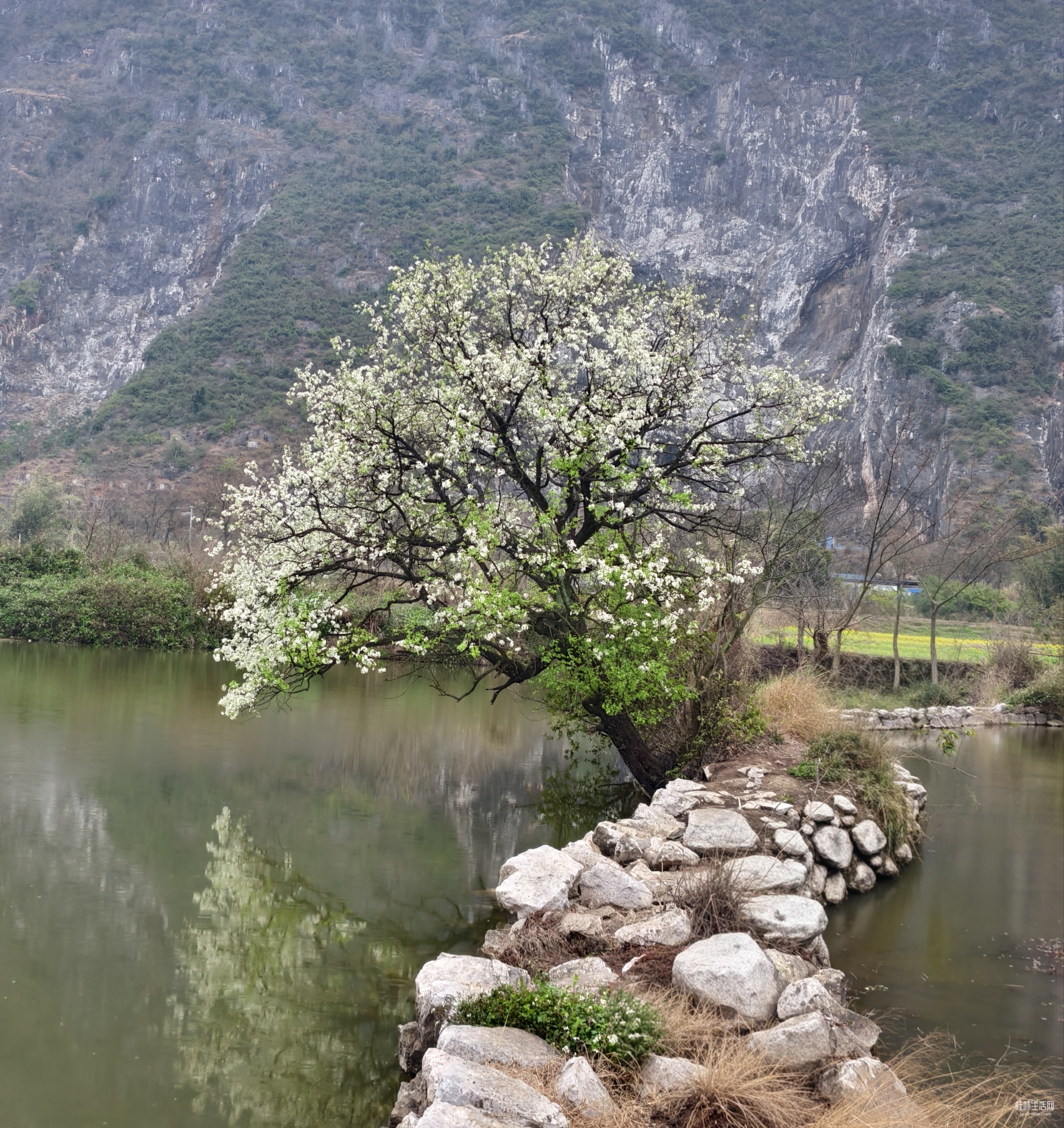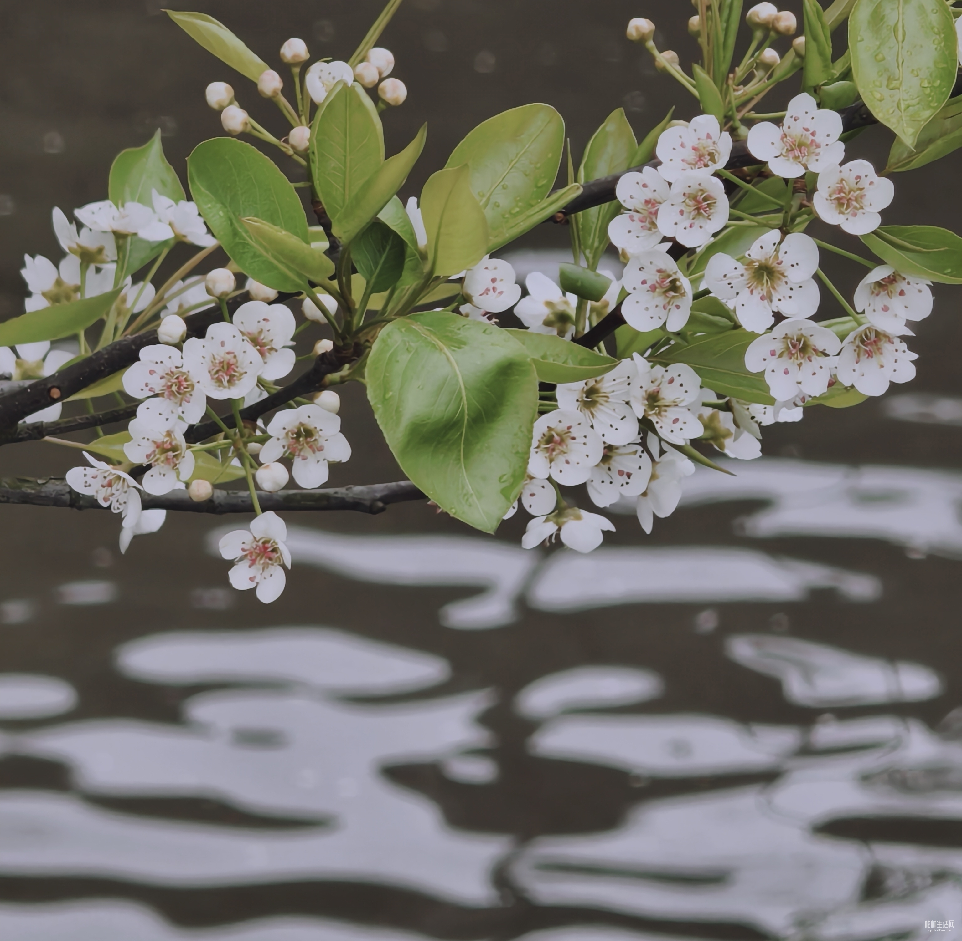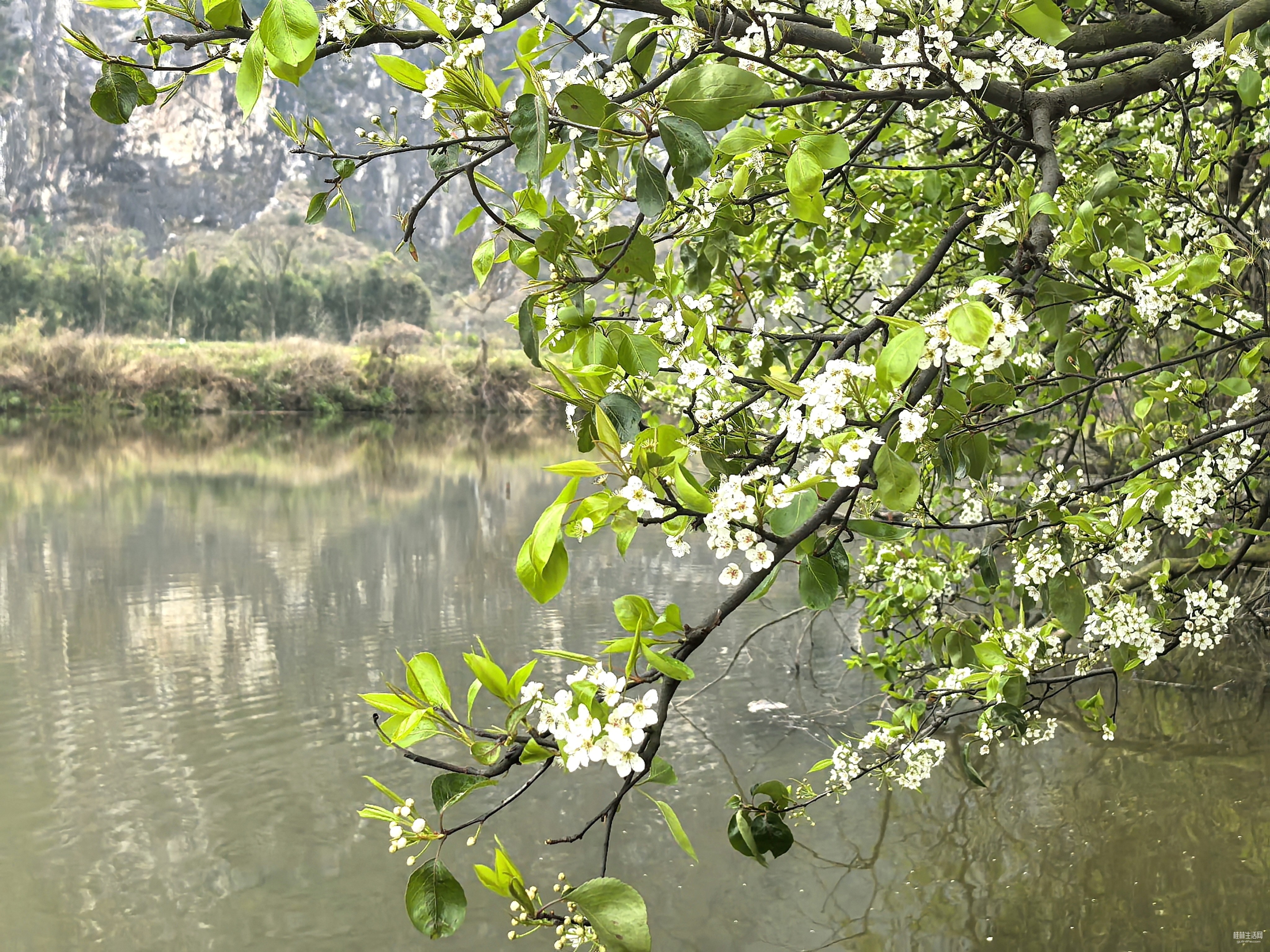 河水缓缓流淌,水中倒影的满树梨花,美得如梦如幻。