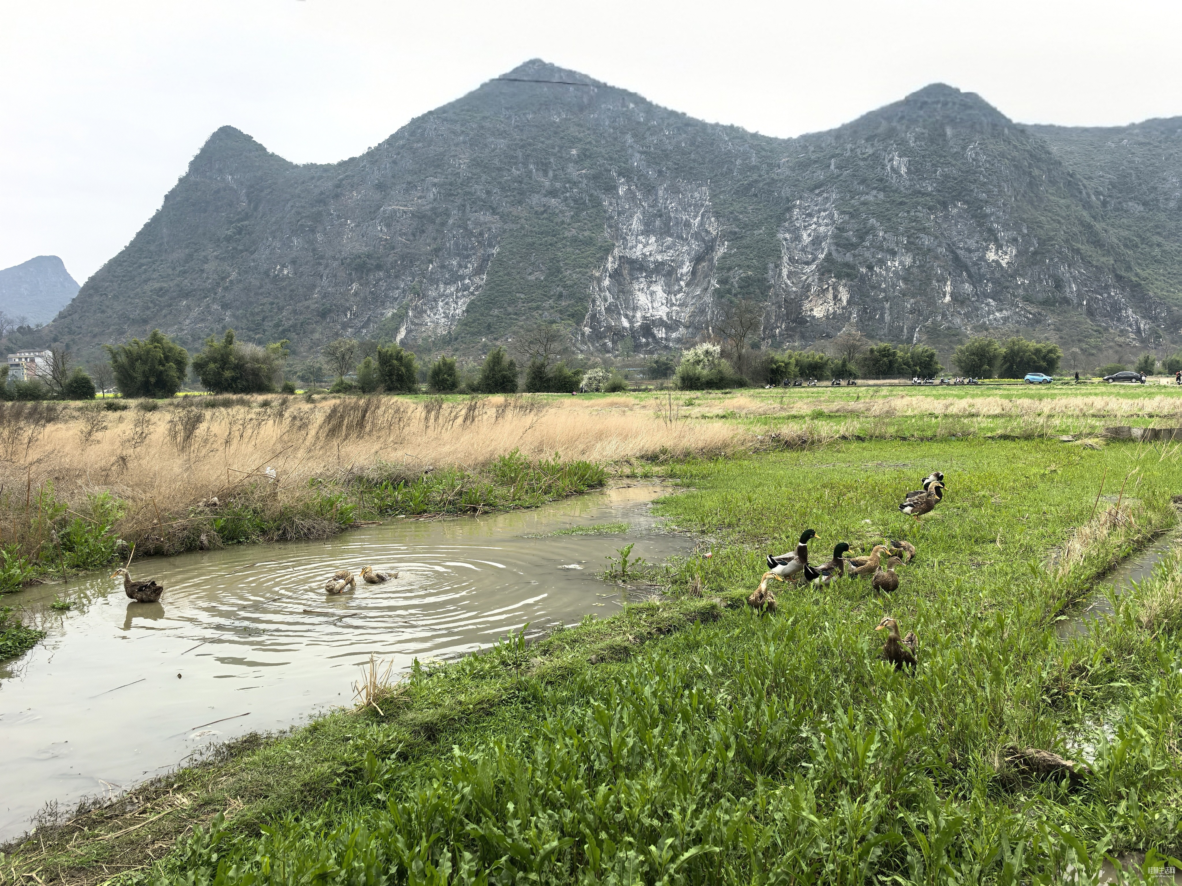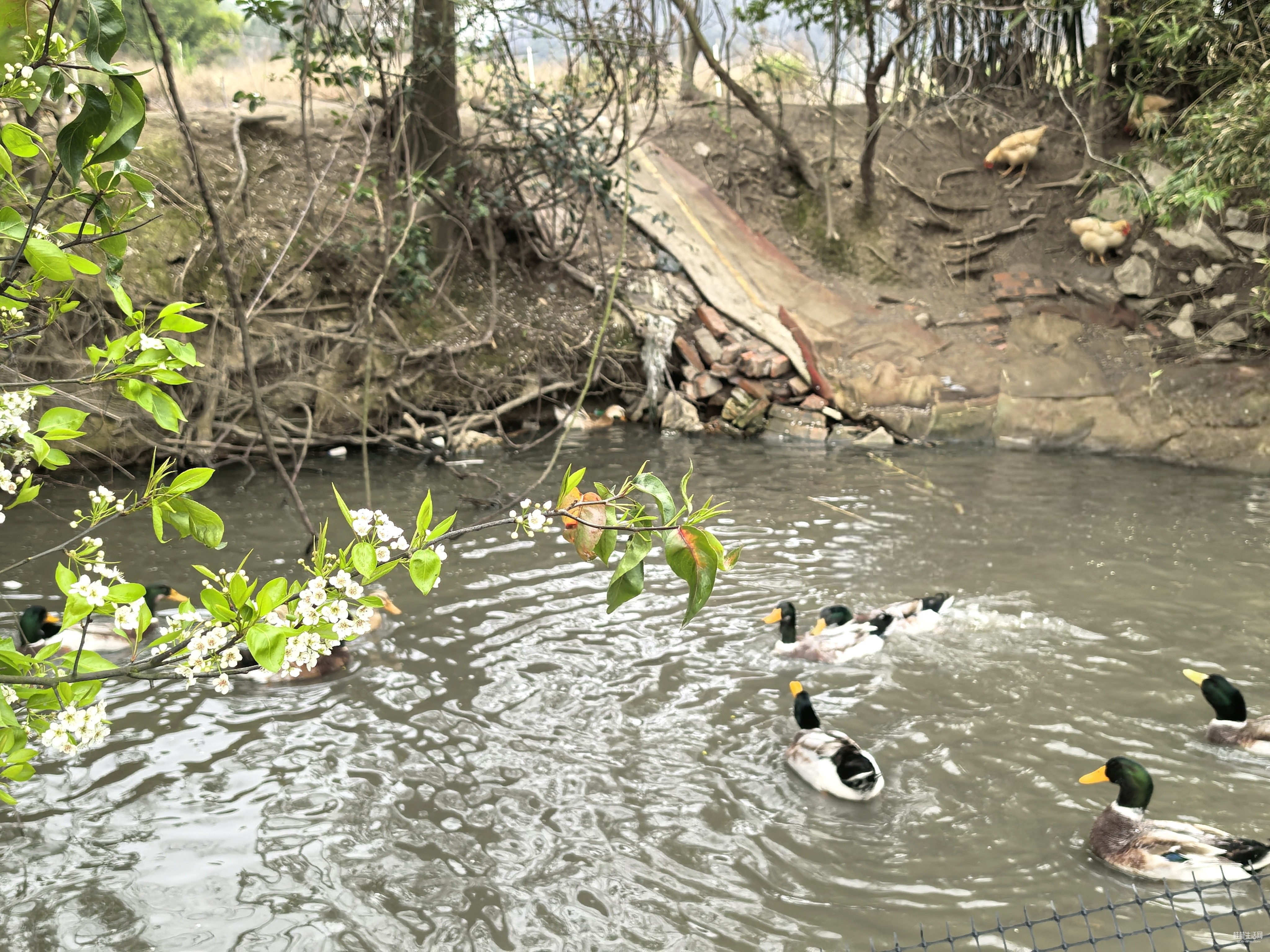 我找了块干净的青石坐下,静静看着这画面。梨花映春水,春水戏群鸭,乡村的春日,没有城市的喧嚣,就只有这般纯粹的美好。