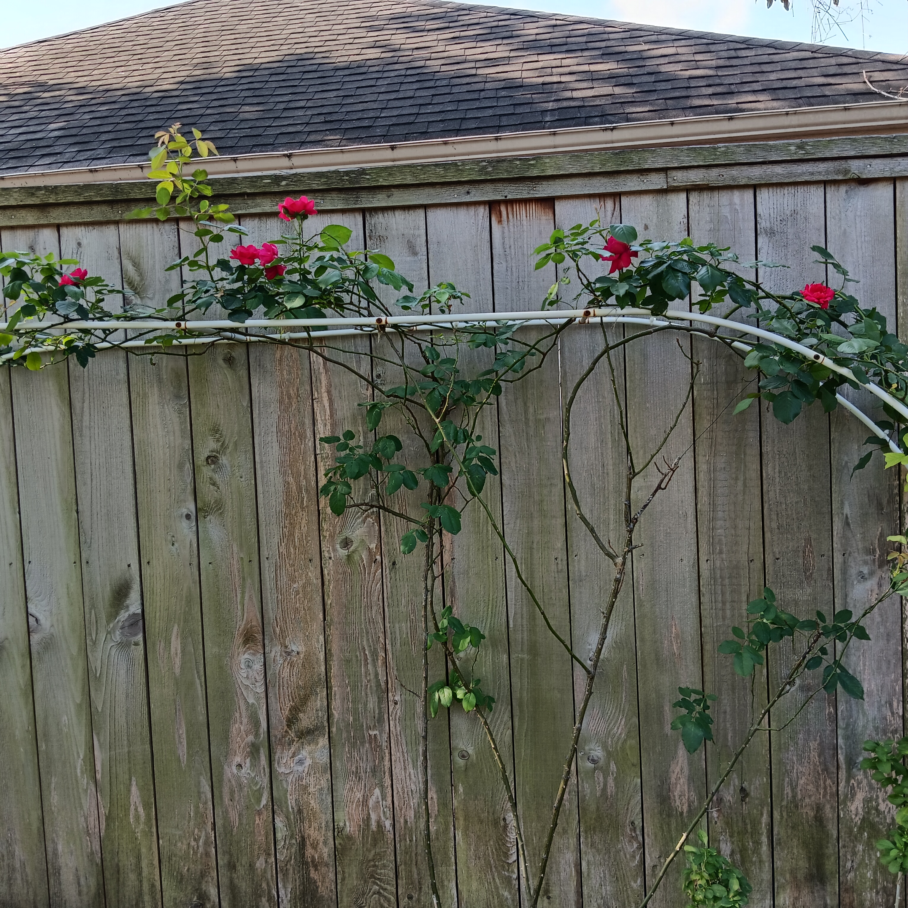 我家后院的攀藤玫瑰,红艳艳的,初绽笑脸,很是娇媚。
