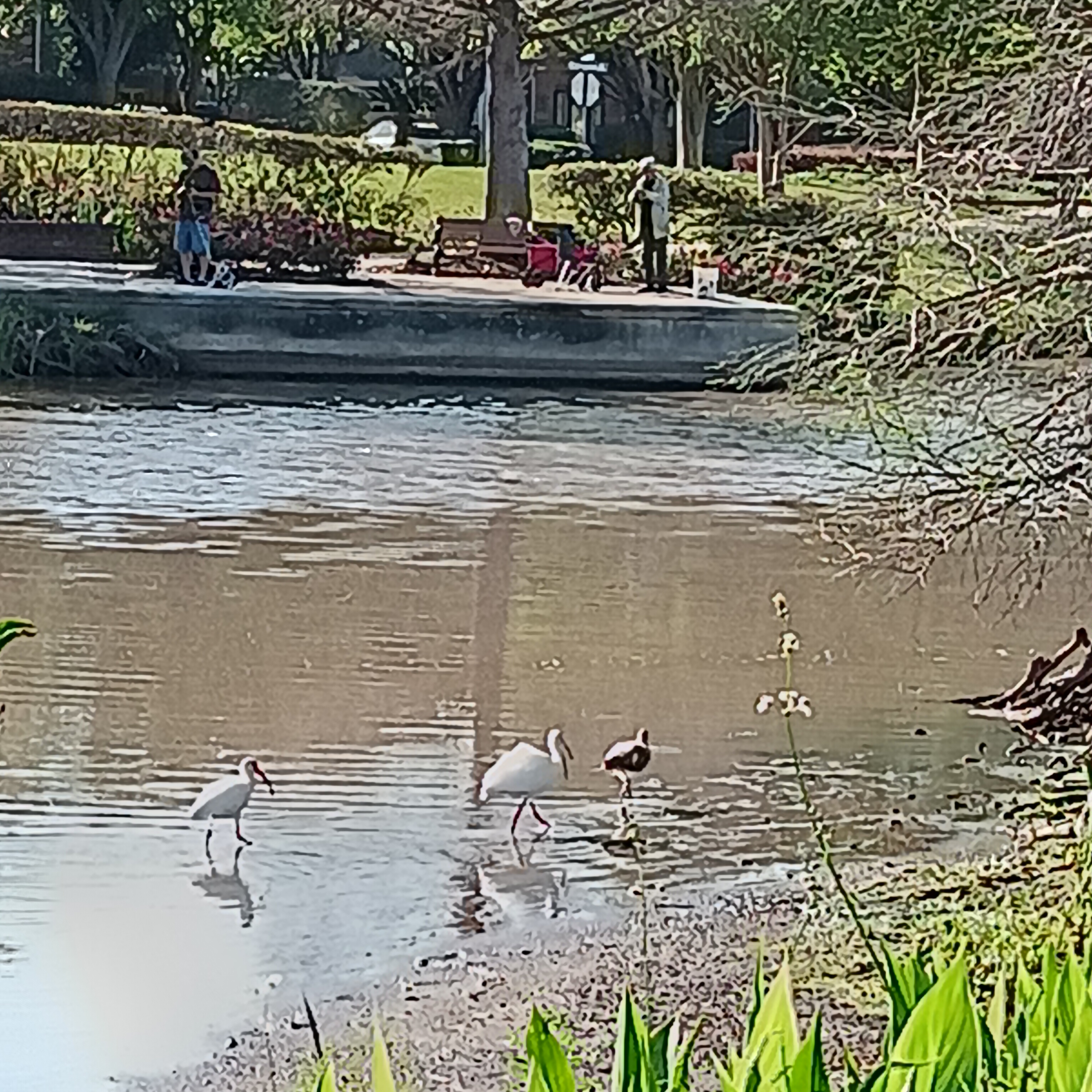 不时遇到在湖边遛狗的人。