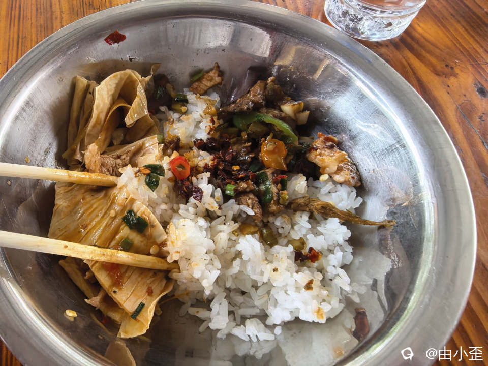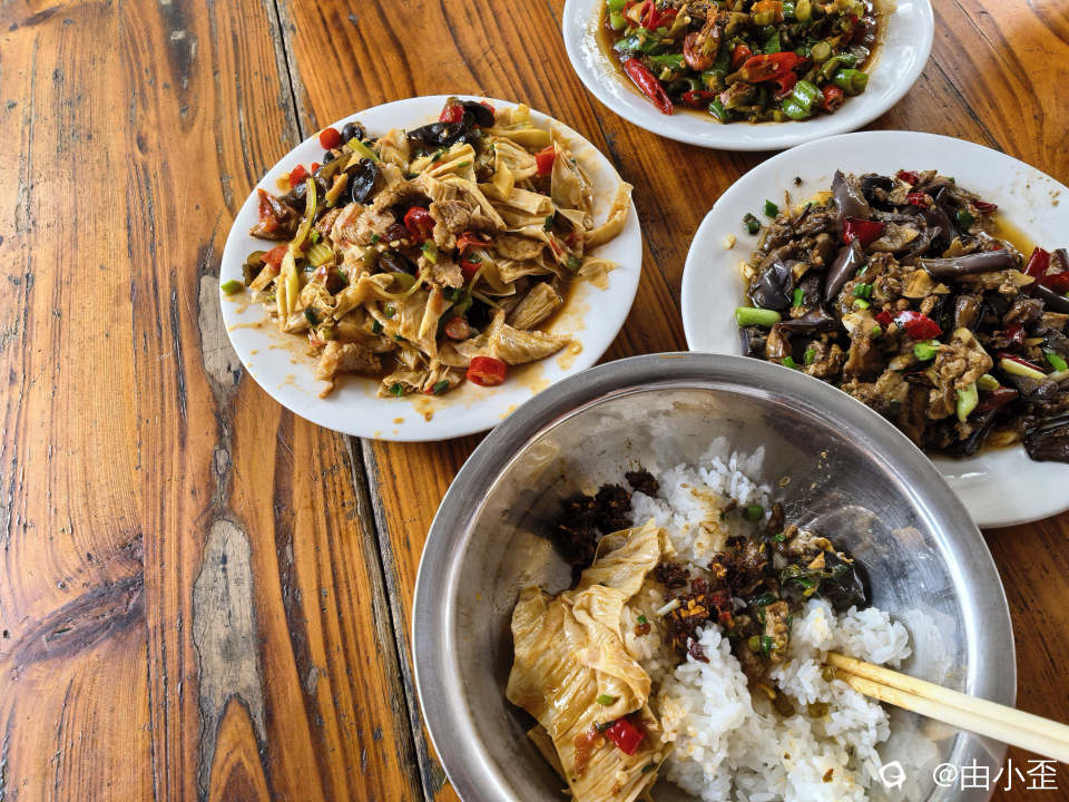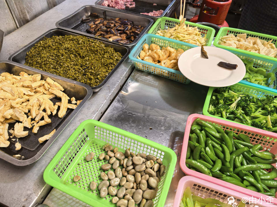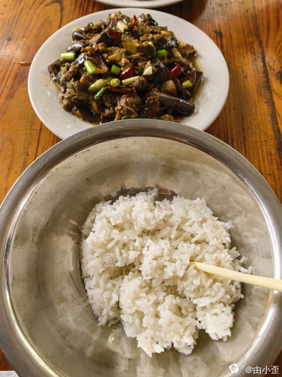 老板说,荤菜素菜一起配,十五块一碟,我们选了茄子和小鱼干等,老板怕遗忘,就把样品先放在碟子里,第一次看到这样的操作,老板智慧了!😋