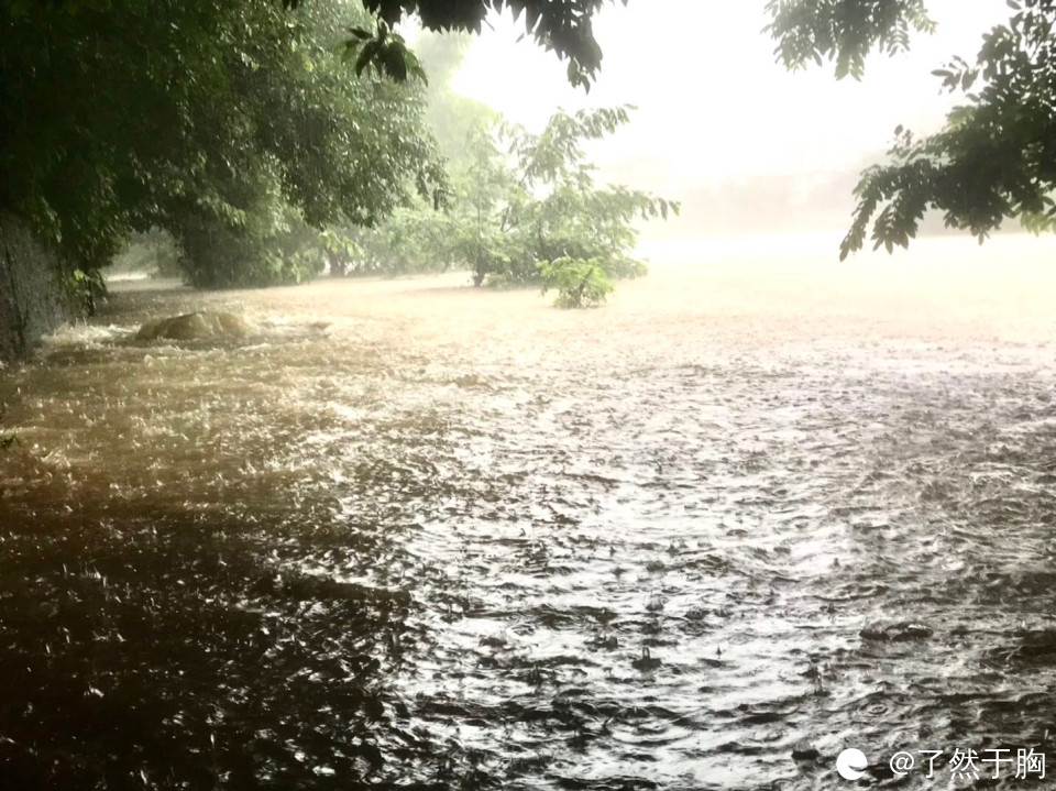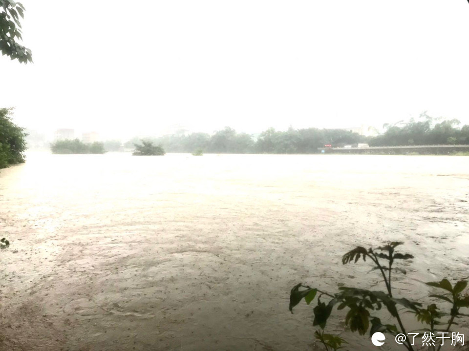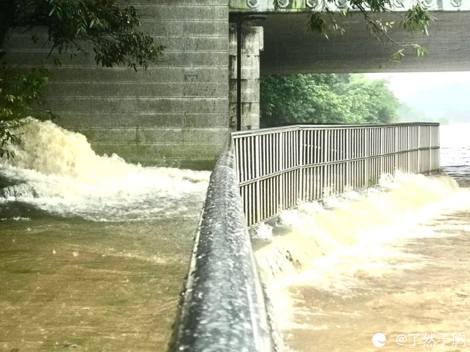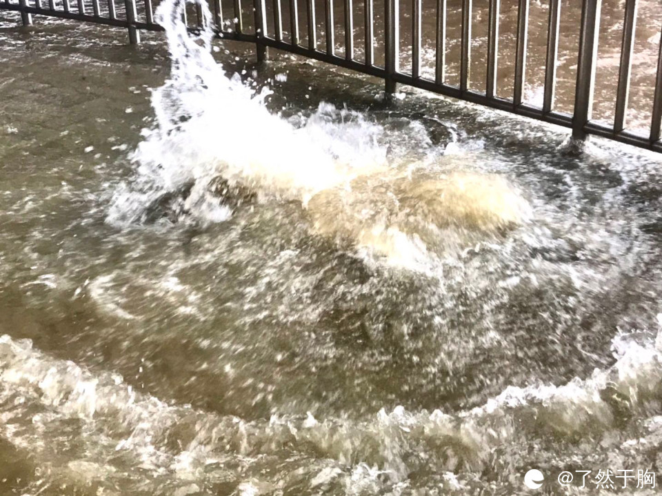 雨大,两岸所有的水都流入河道,许多排污管道的井盖都被冲开往外喷水,流入河道。到上午十时许,部分江畔的步道已经被水淹没了。