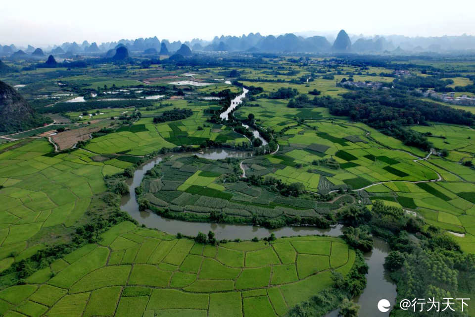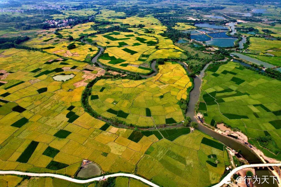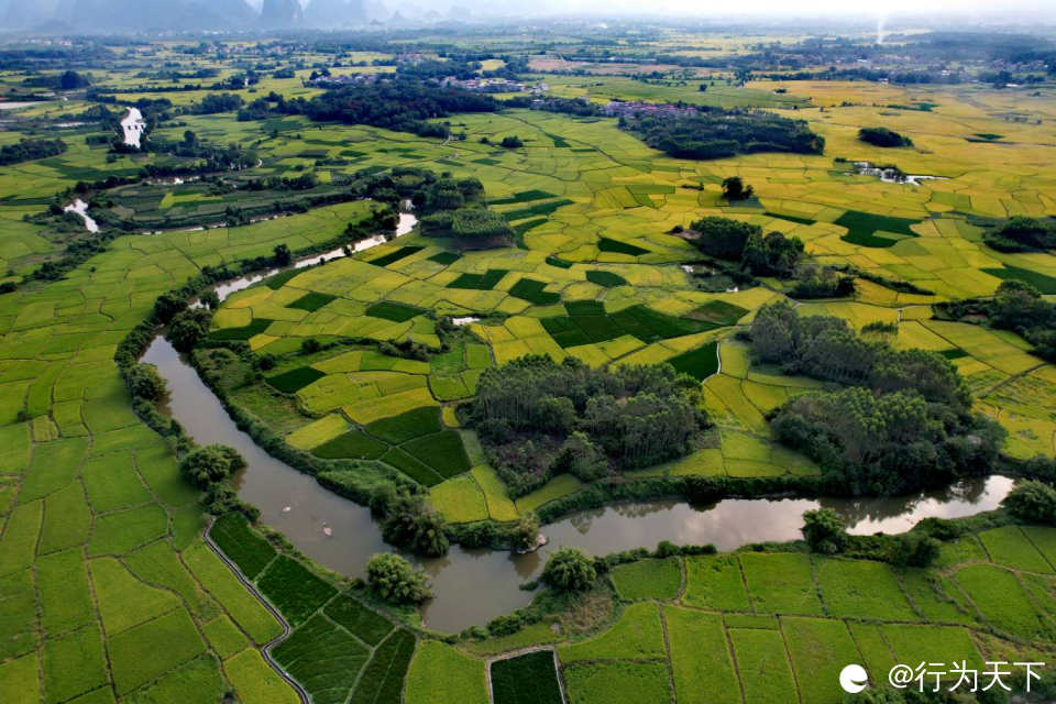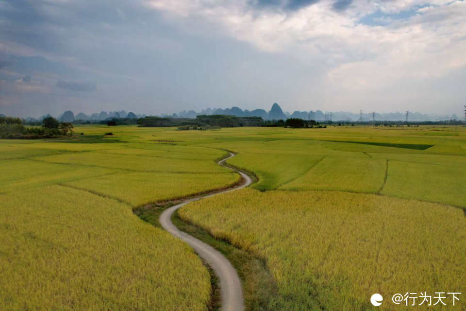 有一种金秋,叫做稻香,去不了诗和远方,就去临桂四塘稻田找找吧,这里有龙形的小路,龙形、心形的稻田。桂林金秋十月醉美的景,是湛蓝的天空和金黄的稻田,临桂区四塘镇大湾村上千亩水稻成熟了!连绵青山绿水间,金黄色稻浪层层平铺,如同描绘在秋天的油画世界。