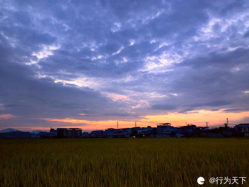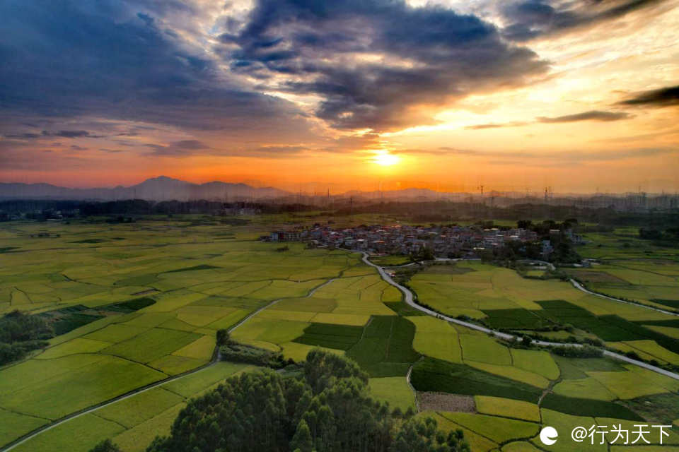 晚霞映衬下,稻田与村庄、公路构成一幅美丽的生态田园画卷,就像宫崎骏动漫里的秋天一样,早已成为了临桂的网红打卡点。过往的行人更会忍不住停下来,在这里逗留片刻,欣赏这绚烂的稻田、晚霞。