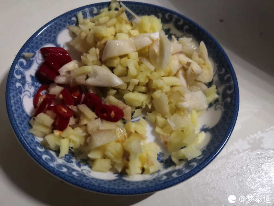 雷公菌清洗干净,还需要焯水。生姜大蒜粒红椒切末备用。