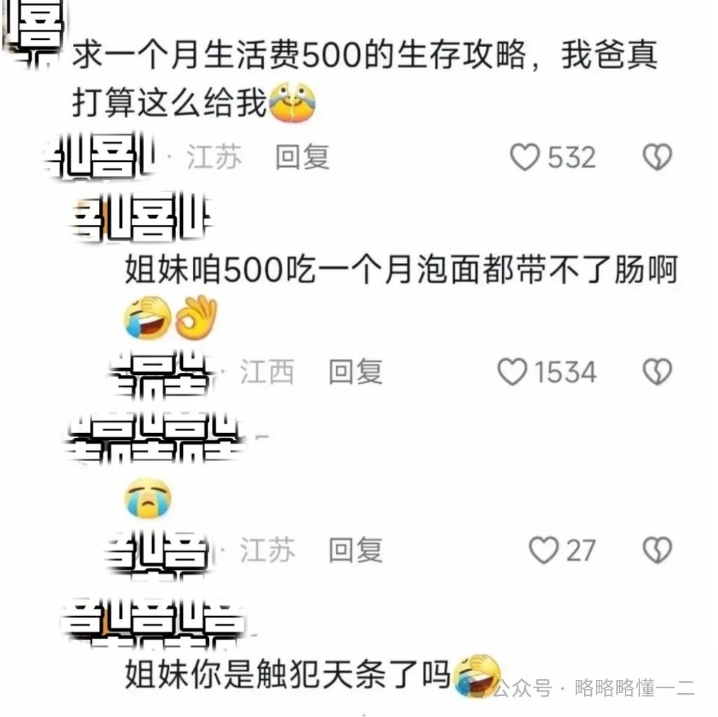 网友的评论更加扎心,一个月500块钱的生活费,吃泡面都带不了肠,真是出不了一点攻略,因为大家也没有这样的经历啊!