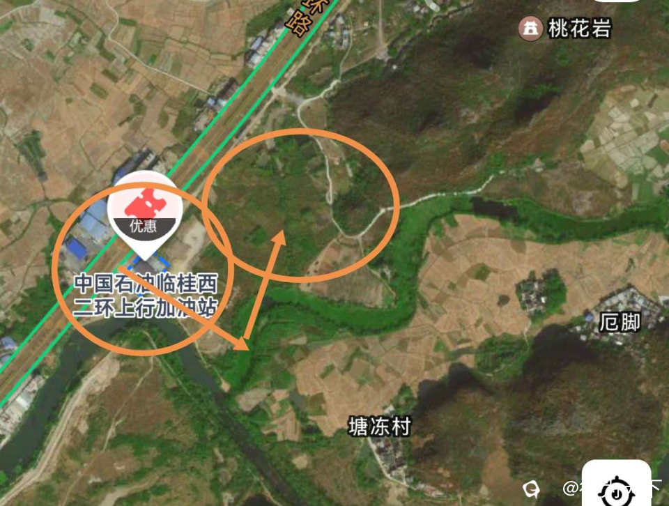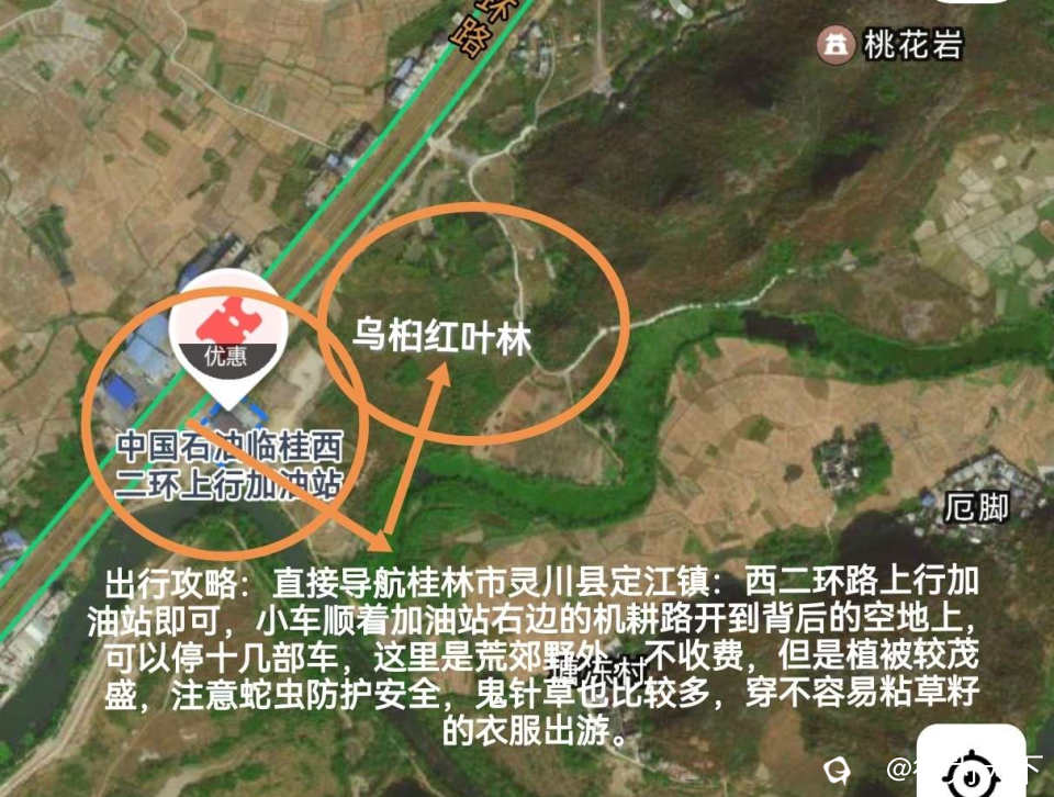 出行攻略:直接导航桂林市灵川县定江镇:西二环路(中国石油)上行加油站即可,小车顺着加油站右边的机耕路开到背后的空地上,可以停十几部车,这里是荒郊野外,不收费,但是植被较茂盛,注意蛇虫防护安全,鬼针草也比较多,穿不容易粘草籽的衣服出游。
