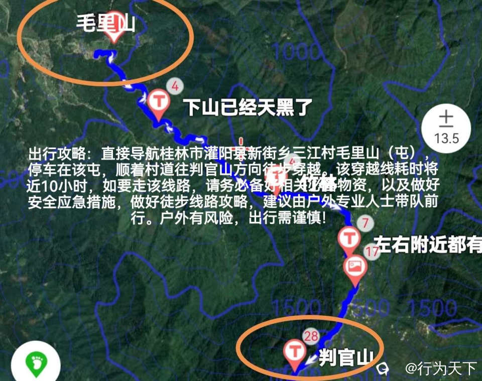 出行攻略:直接导航桂林市灌阳县新街乡三江村毛里山(屯),停车在该屯,顺着村道往判官山方向徒步穿越。