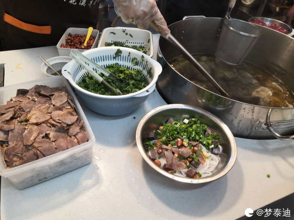 二两还是用统一的米粉碗。首次品尝还是选择卤牛肉原汤粉比较好。你看那一大桶纯牛骨和牛肉熬出来的原汤,最能体现牛肉原汤粉的鲜美。