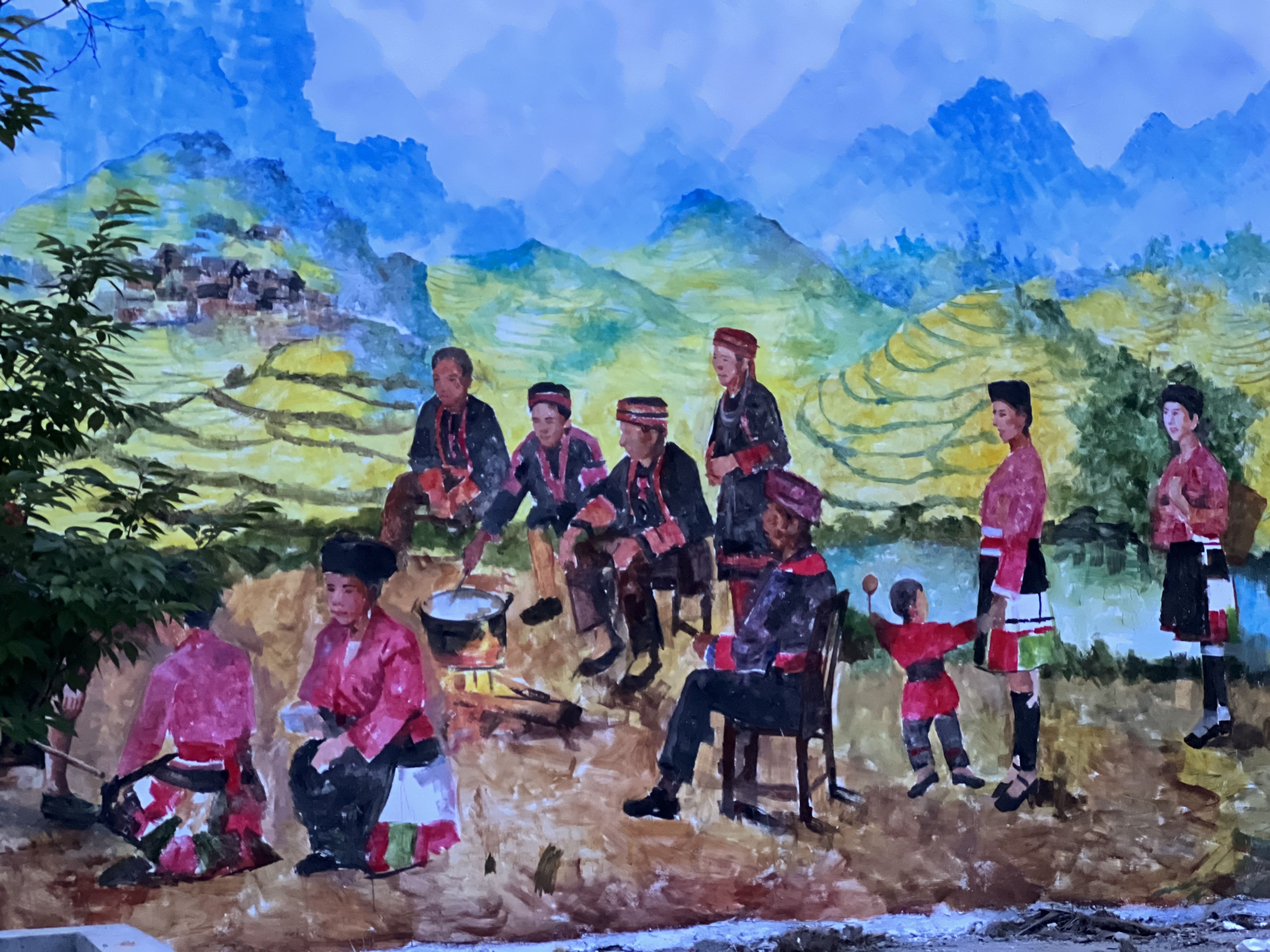 步道边墙体上有很多彩绘,从画里能看出来泗水梯田多,还是红瑶的聚居地区。