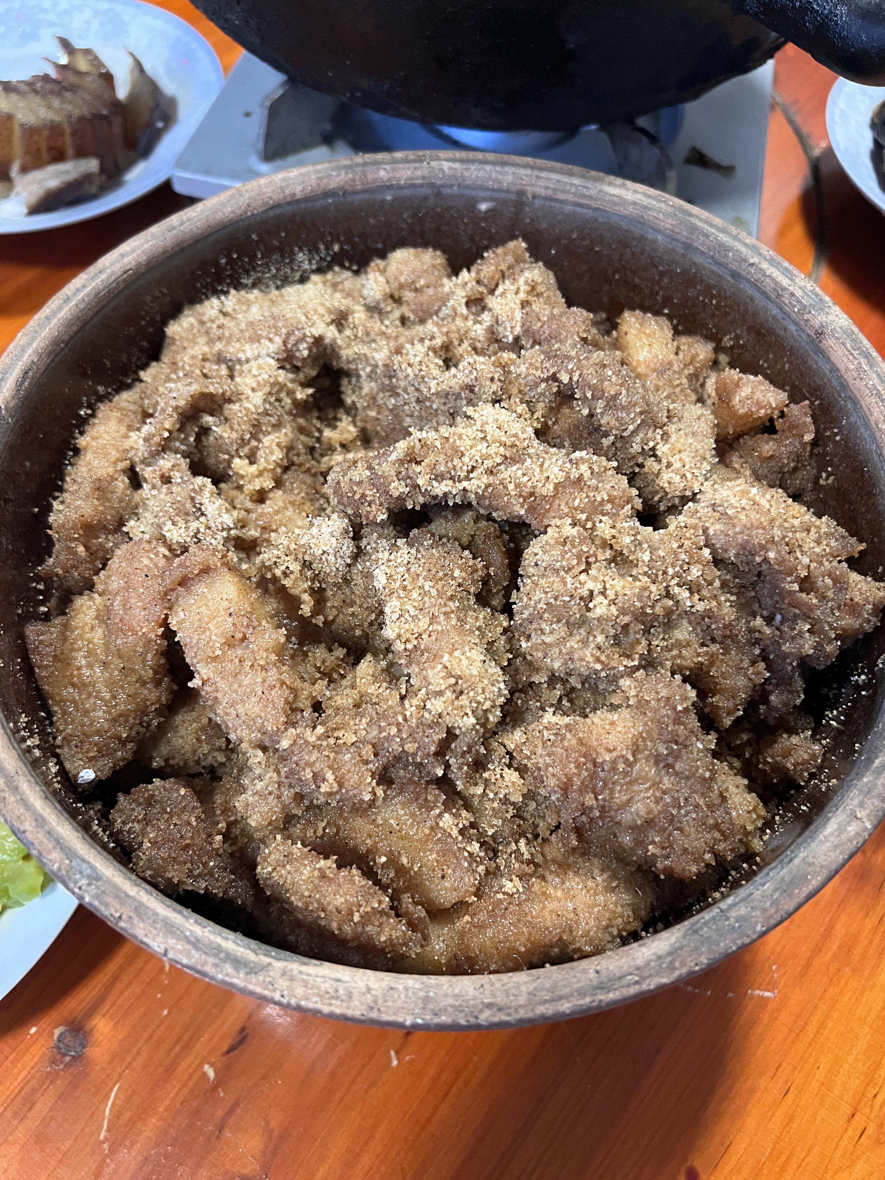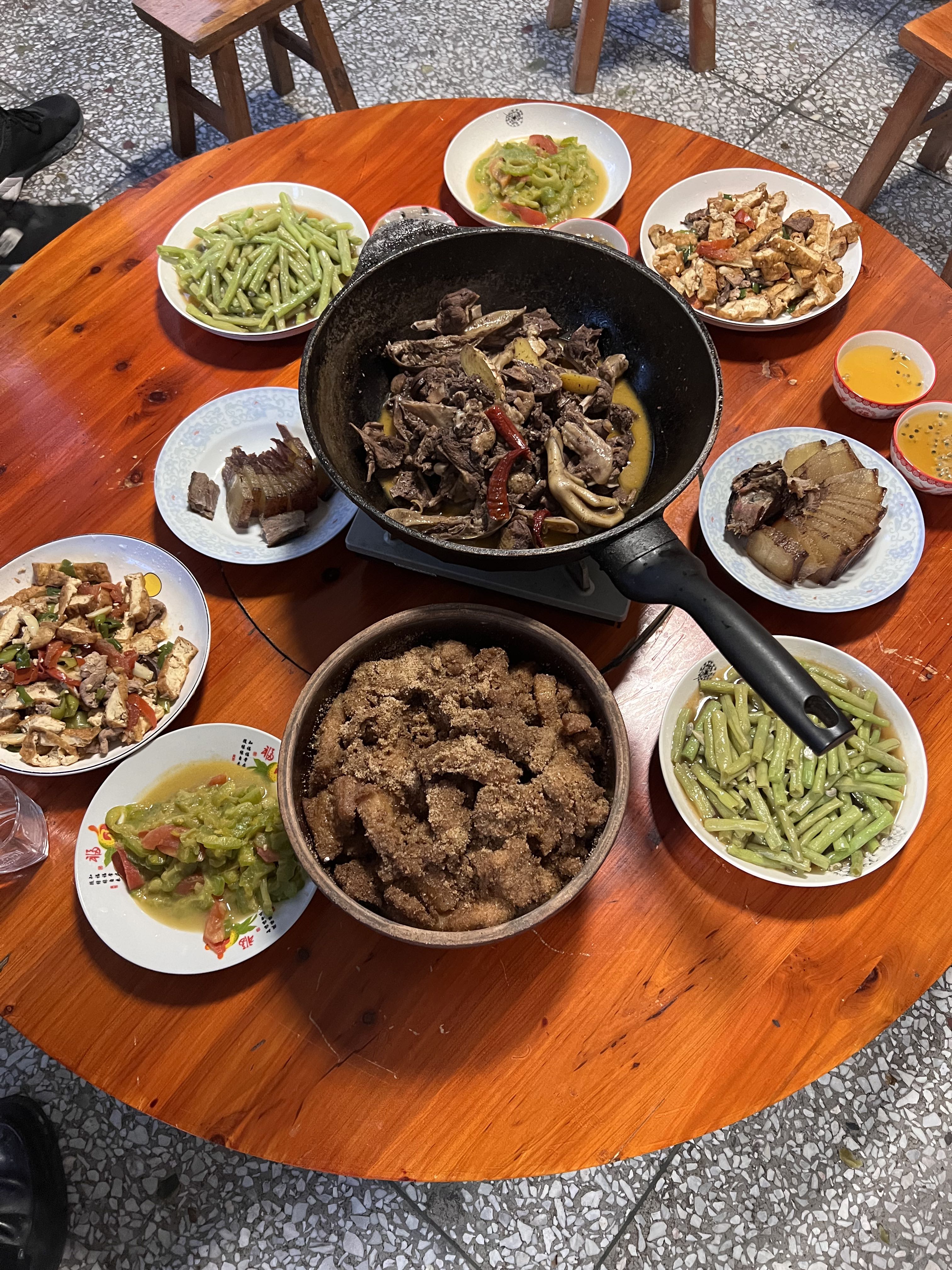 表舅和舅娘做了一桌子菜,特别是表舅听说我要来,特意给我做了粉蒸肉!因为我从小爱吃肉在亲朋好友圈里出了名,他说搬新房子以后我是第一次来,要搬出压箱底的土钵来做粉蒸肉!