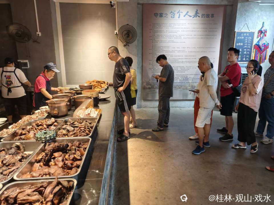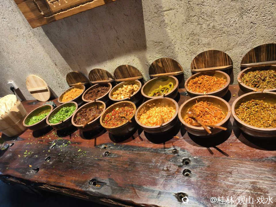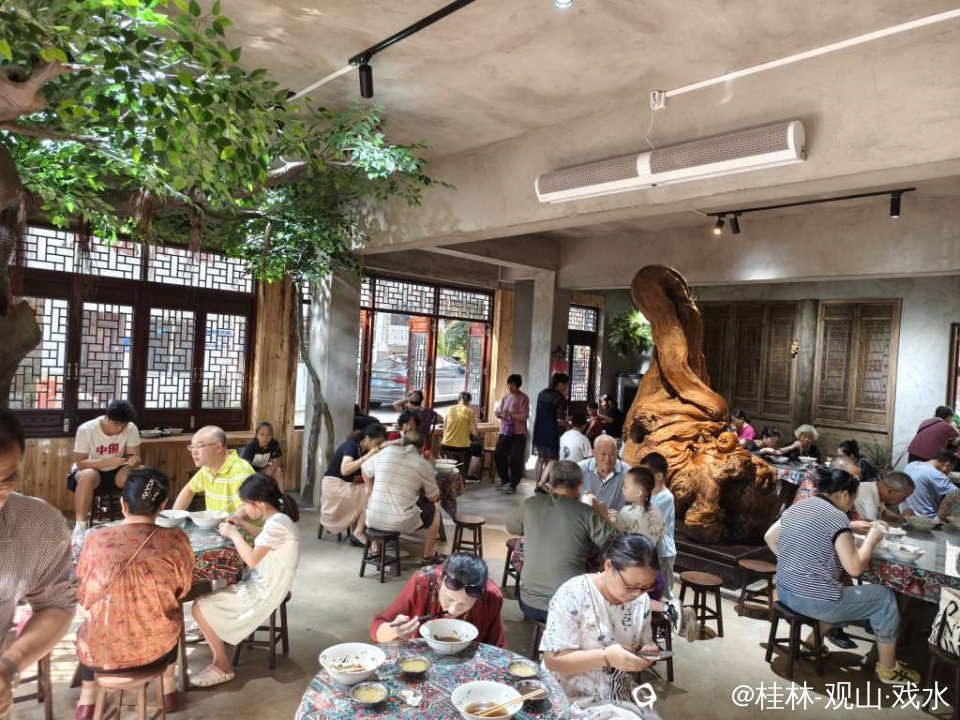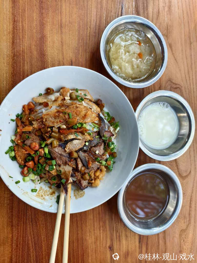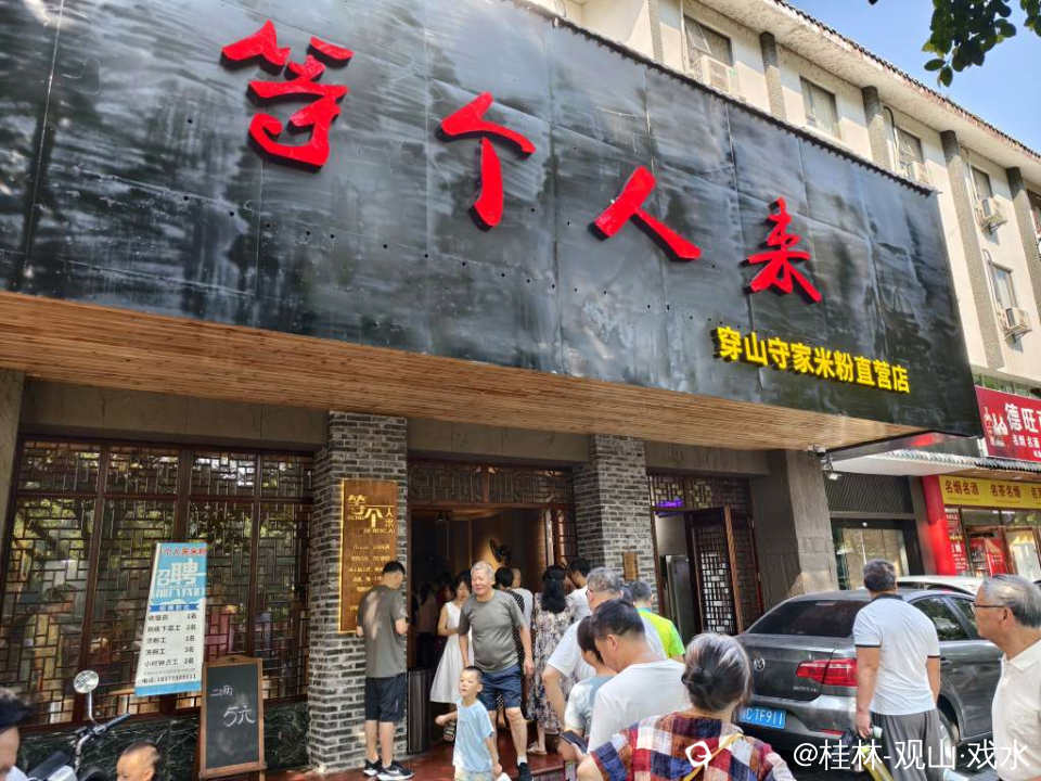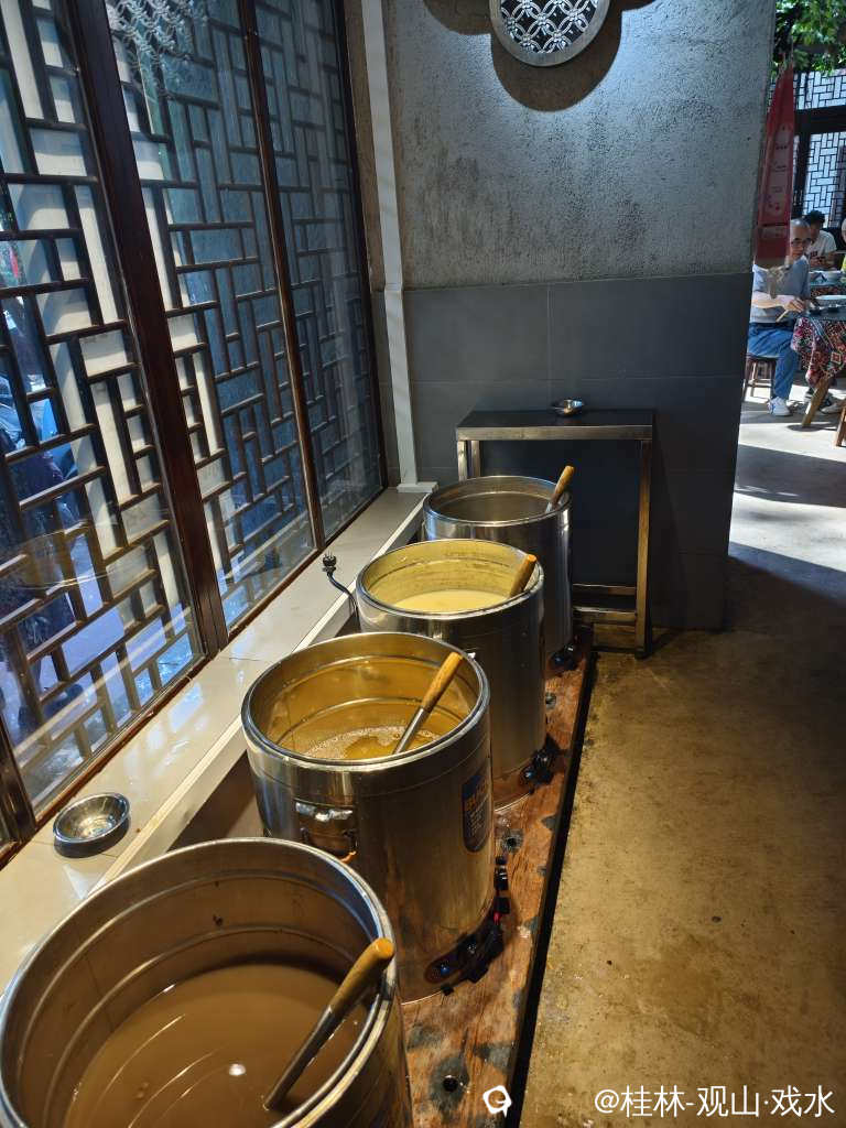 2025.7.26。晴。预报最高37℃。今天穿过七星景区,来到其后门停车场马路对面,网红守家米粉(原穿山公园门口)在此新开的分店,尝尝该店的桂林卤菜米粉。排队10分钟。感觉:锅烧牛肉量多,铺满面上。5元/2两一般,总体卤水偏咸。内人要了全牛肉,嫌多。牛肉偏咸,但有牛肉鲜香味。锅烧不错。12种配料。4大桶白木耳枸杞,绿豆,小米汤,豆浆(无糖)随便喝。总有20人左右排着队。有汤粉(性价比太差),无煮粉。店堂较大,就餐环境过得去。