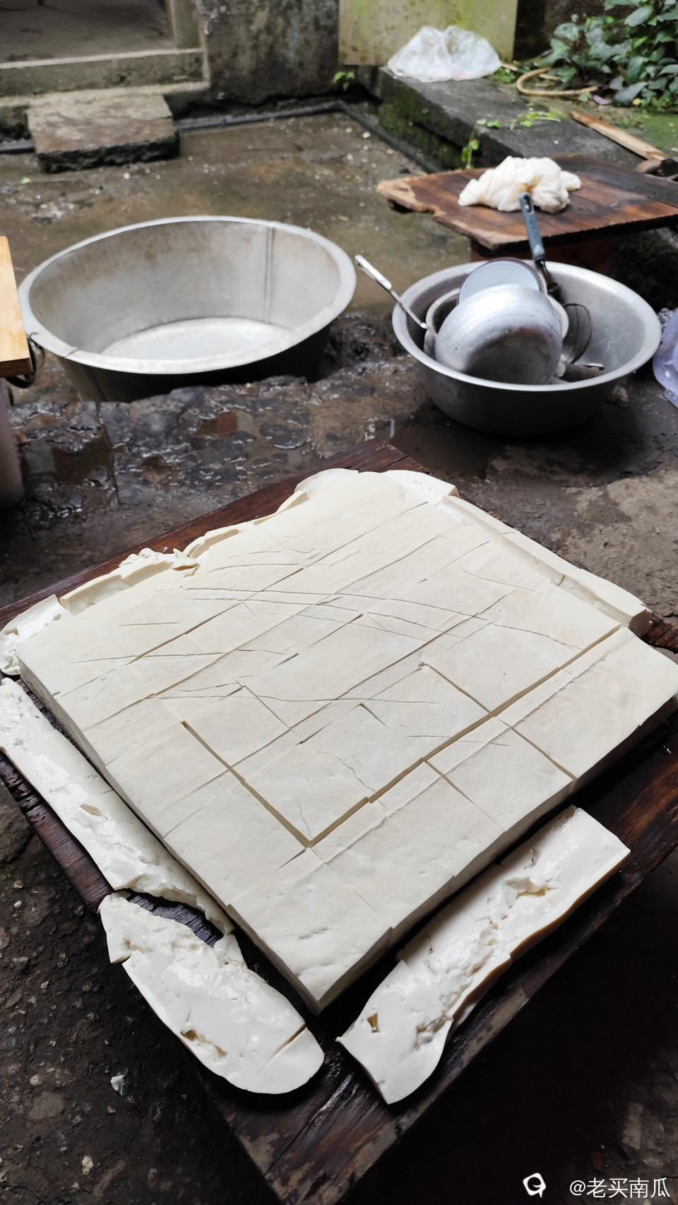 我们小时候见过,黄豆泡水发张后,用石磨磨成浆,纱布过滤成豆浆,豆浆烧开,用石膏点卤,成豆腐脑,豆腐脑装木箱沥干成水豆腐。
