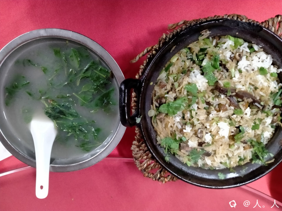 25元一份,现场制作,鳝片拌在米饭中用砂锅煲,鳝骨和鳝尾煮枸杞菜汤,用了六条黄鳝,大约半小时。砂锅底下的草垫也有特色。