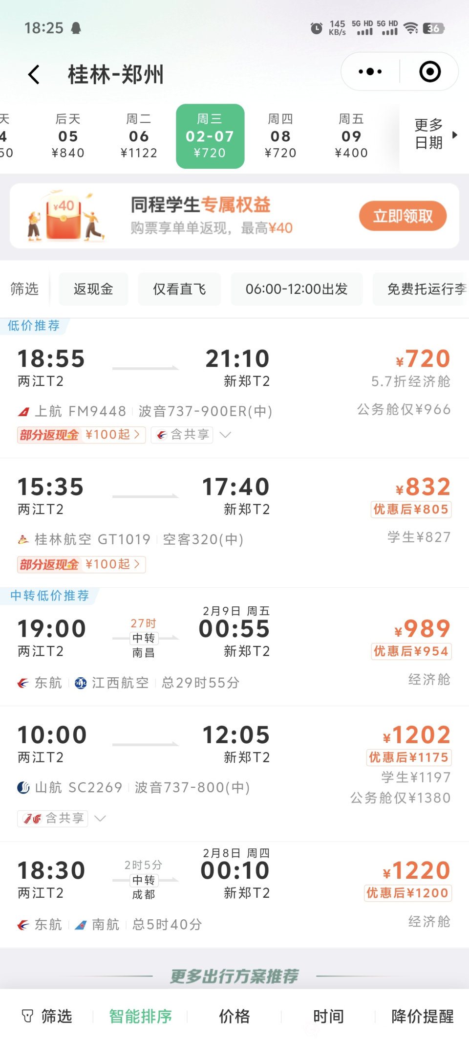 法制传奇 发表于 2024-02-03 18:36 还真有。。。。我搜索都是上海,重庆,北京,大同这些地方。。。。从没见过桂林航空冒出来 但是桂林航空的票价,总比其他航空贵那么一点点!如果不针对时间,对时间无所谓的人群,大概率不会选,比如你图上的到郑州的,有人愿意选六点的上航,都不一定选三点半的桂航!遇到家乡情节,没坐过的,或许会坐