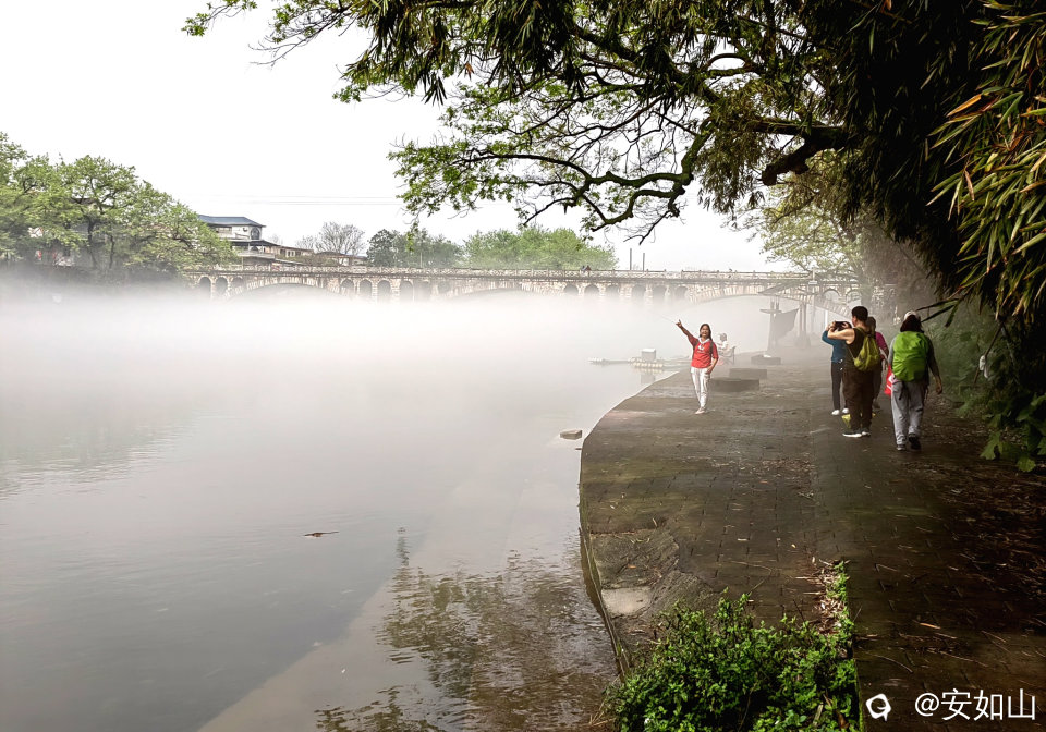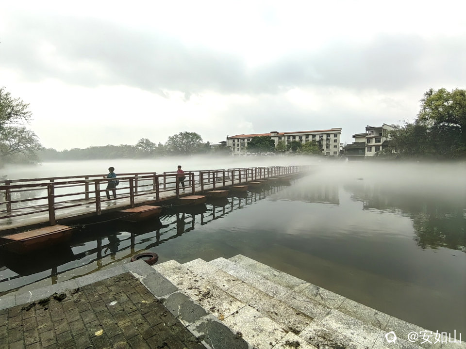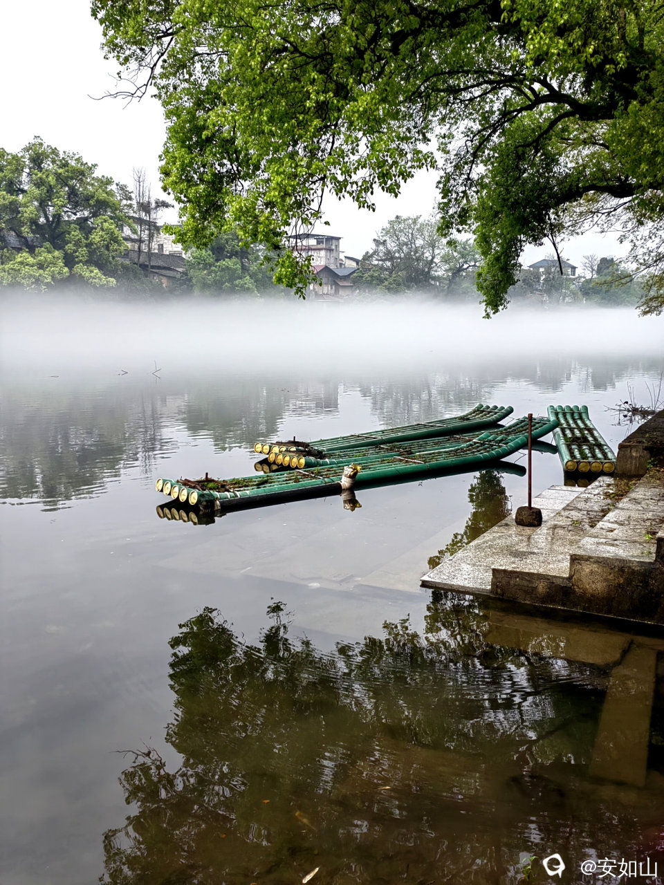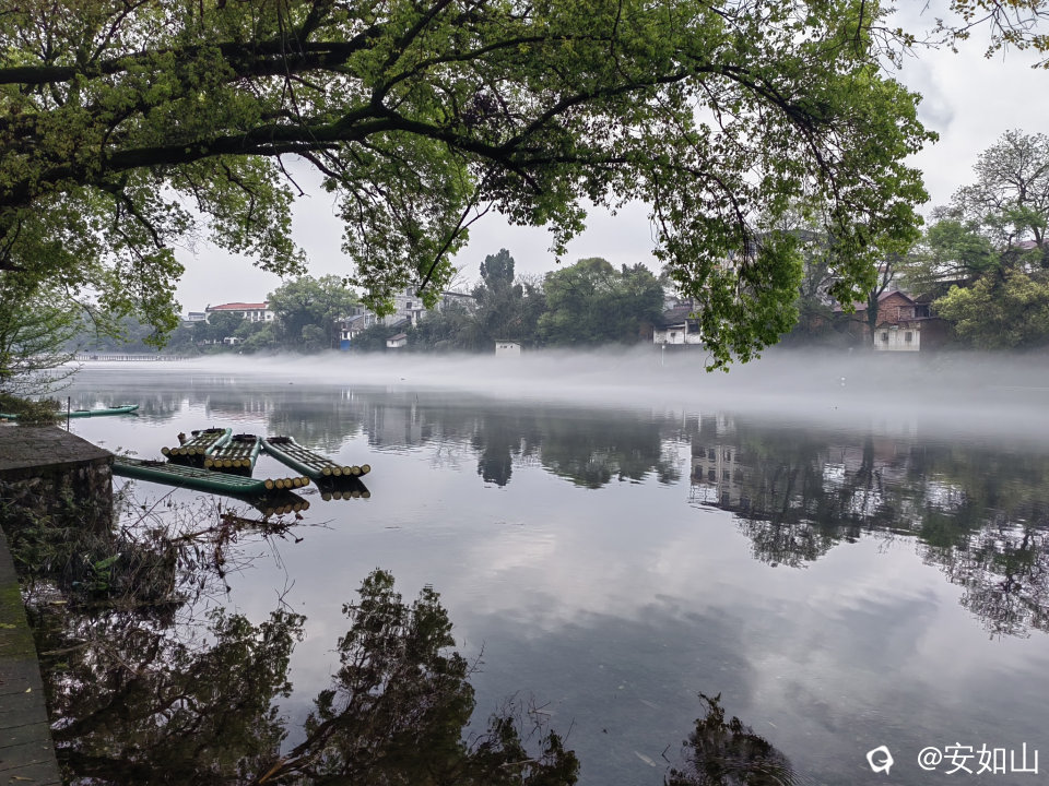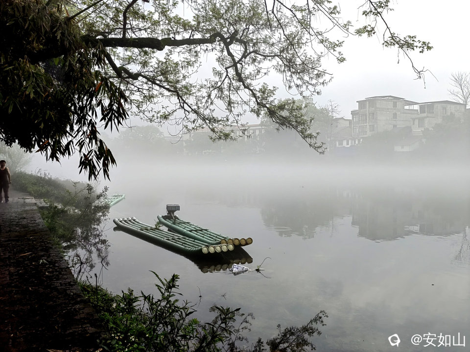 甘棠江上的平流雾确实漂亮,也难得,我记得耍像机的都知道有个湖南郴州小东江,那里的平流雾常有,一条不大的小东江,一条渔翁的钓鱼船,摄影大师或大湿们就会拍出得奖大片,今日的甘棠江甩小东江二条街!我走在江边道上,两岸风景让我心情大好,拿个手机,拍个不停,眼前江景走心入诗,正是“水光潋滟晴方好,山色空蒙雨亦奇”,走进江边树林便“云深不知处”,看江面独舟“野渡无人舟自横”